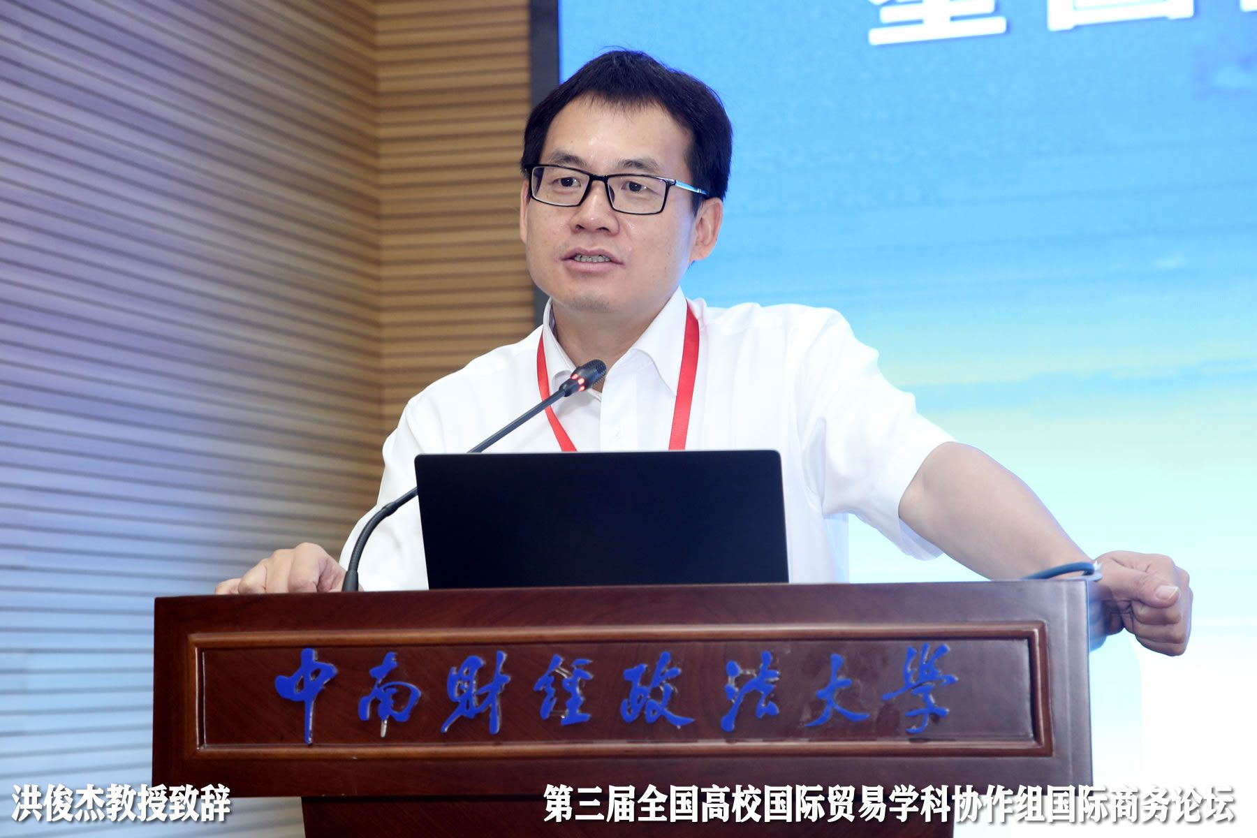 接着,全国高校国际贸易学科协作组国际商务论坛秘书长、 对外经济贸易大学副校长、教育部人才项目特聘教授洪俊杰发言,首先对承办方与各位参会代表表示感谢。其次,就国际商务论坛秘书处的主要工作做了简单的介绍。最后,他提出国际商务论坛致力于推动国际贸易学科在中国的发展,并再次现场的各位专家表示感谢。