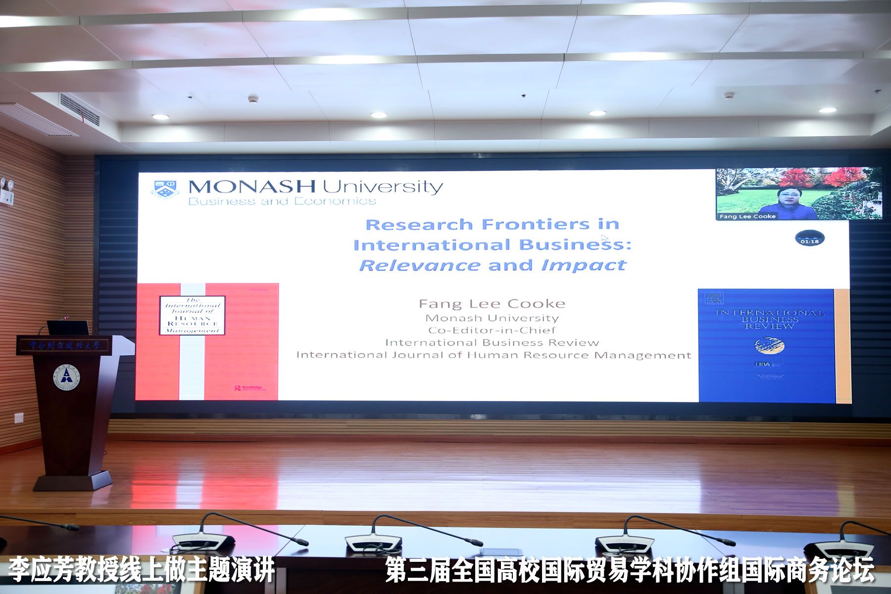 接着,澳大利亚社会科学院院士,莫纳什大学商学院副院长李应芳教授做了主题为“Research Frontiers in International Business”的报告。她首先介绍了IB的研究趋势,同时从关心社会责任、商业环境活动等五个方面掌握研究方向。