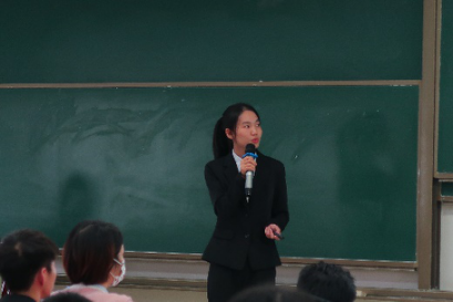 第六位候选人是工商国际1901班张婧妤同学,她从思想政治素质、学术科研活动及专业技能、文体特长、团学活动及学生工作、志愿服务及社会实践五个方面进行答辩分享。