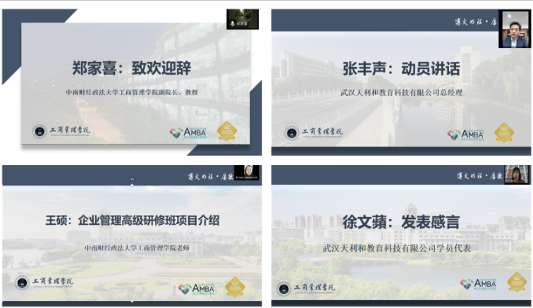 今日云景好,水绿秋山明。2021年11月6日上午,我院2021年企业管理第二期高级研修班通过腾讯会议线上直播平台顺利开班。参加开班典礼的有副院长郑家喜教授,武汉天利和教育科技有限公司总经理张丰声、运营总监徐刚岭以及60余名来自武汉市的企事业单位学员。开班典礼由我院校友工作和社会合作办公室主任梁昌栋副教授主持。