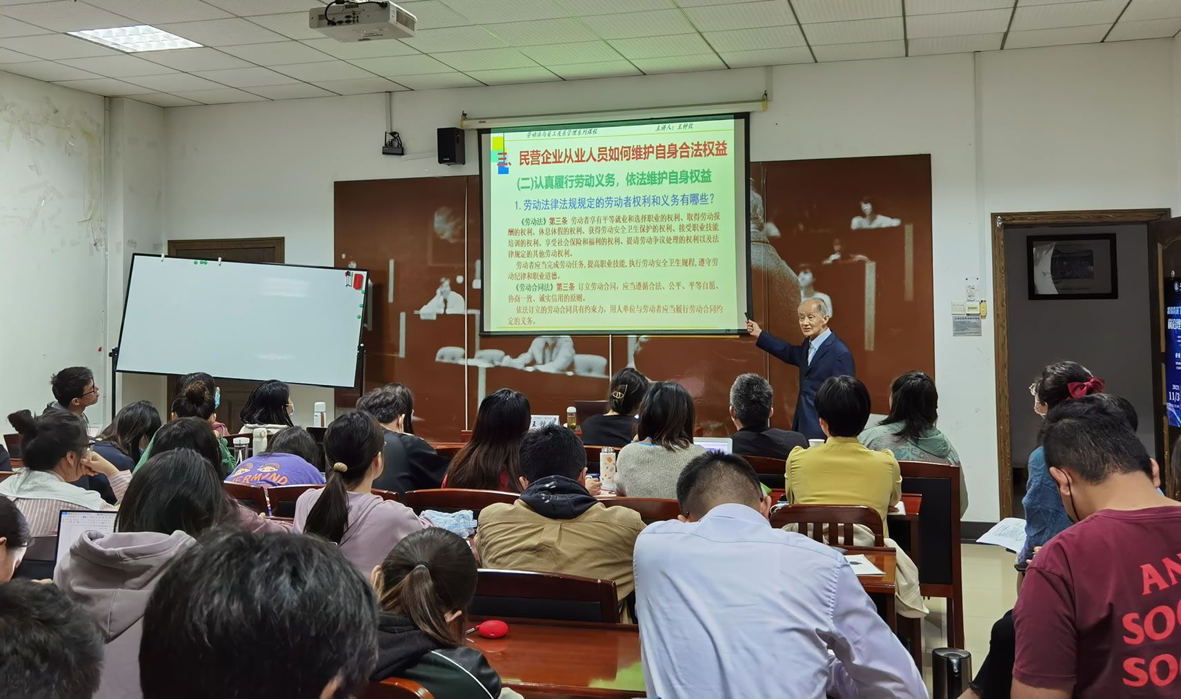 最后,王教授着重讲述了民营企业从业人员如何维护自身权益的方法和依据。王教授用三句话概括了劳动者在从业过程中需注意的事项:第一,用工要签劳动合同;第二,干活要付工资报酬;第三,员工要办社会保险。随后,王教授介绍了劳动者在工作中拥有的权利和相应的义务,并通过引入案例,与现场师生分享了现实生活中存在的劳动争议问题,案例生动有趣,扣人心弦,引人入胜,现场同学始终聚精会神,既学到了相关知识,也增强了在未来职场中维护劳动权益的意识。