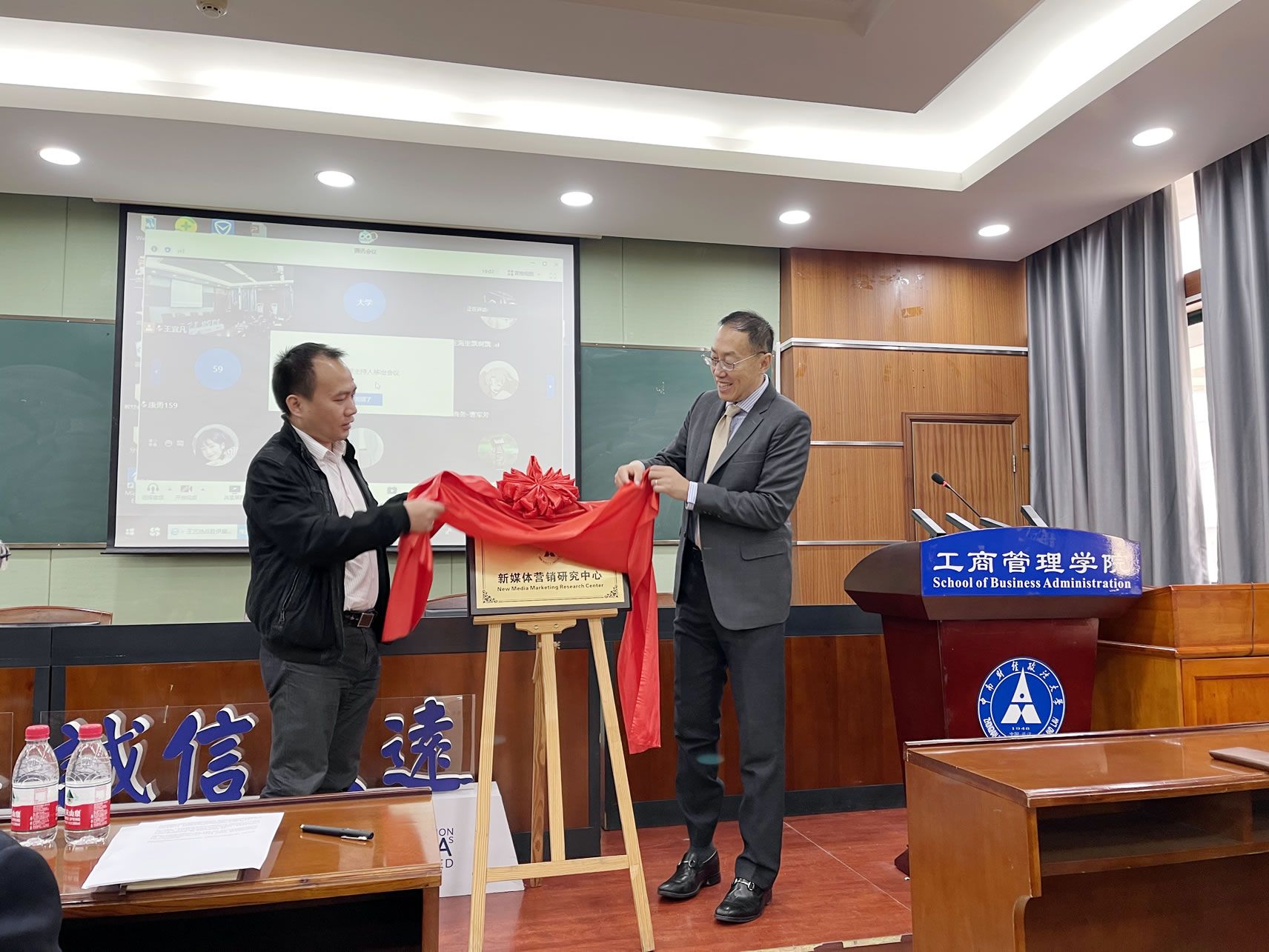 讲座由中国高校市场学研究会新媒体营销专委会主任、工商管理学院副院长费显政教授主持,窦文宇教授和新媒体营销研究中心主任孙洪庆教授共同为新媒体营销研究中心揭牌,