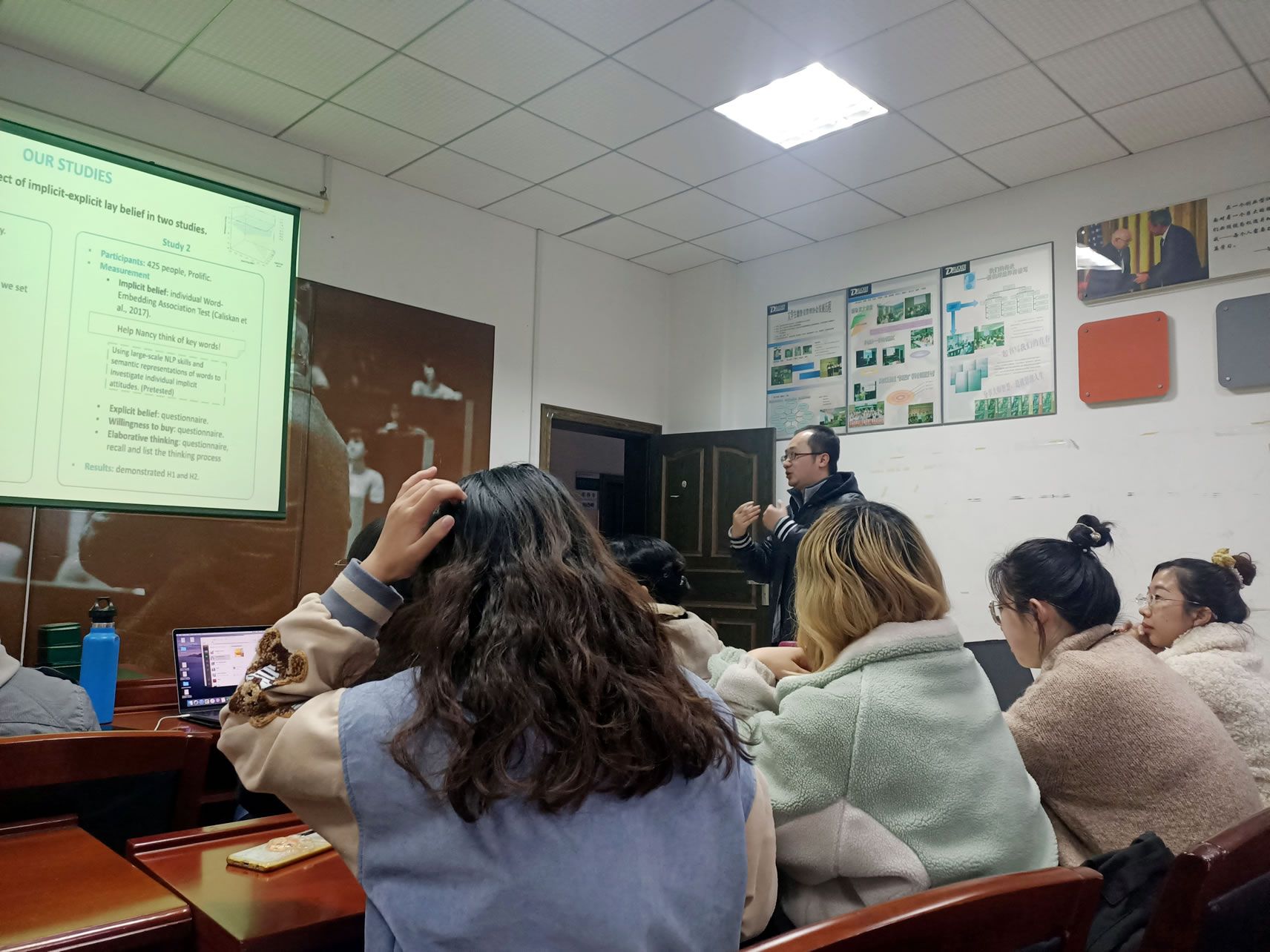 其文章内容对natural&unatural、朴素信念等概念进行定义,对其研究中的假设检验进行解释,举例解释了内隐和外显的交互会影响对丑水果的购买,对实验研究过程进行讲解。同学们对牛熠欣同学讲解的内容进行了讨论,项老师建议在讲述背景内容时可以加强与观众的互动。紧随其后,李志强同学介绍其关于改革开放40余年中国幸福观的内容维度研究的内容,