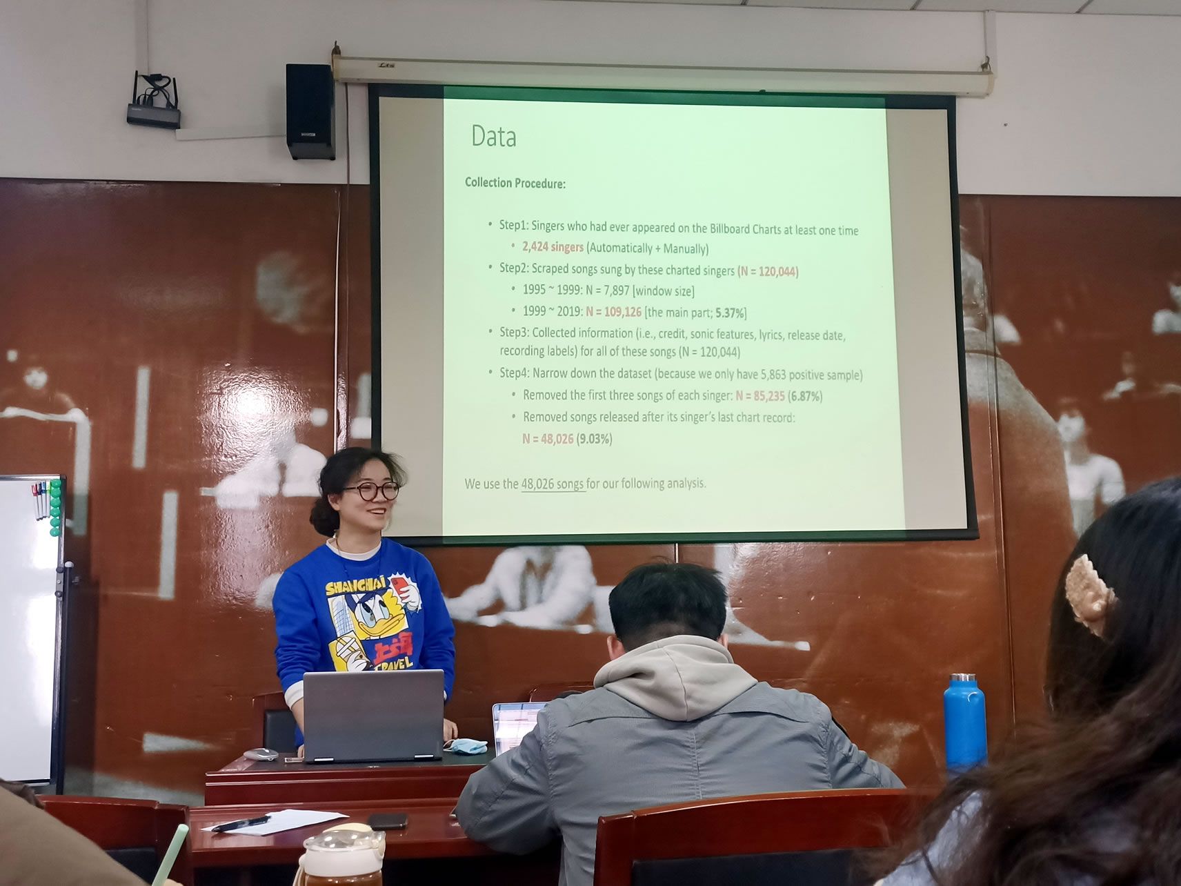 首先,刘佳妮同学对其研究中出现的重复合作、成功等概念进行了界定,解释了如何通过11个维度确定音乐的不同类型。介绍了关于音乐产业中的重复合作是否会影响音乐领域的成功的相关内容。项老师评价到选题的趣味性是研究的重要动力之一,他建议刘佳妮同学分享一些相关的书籍拓宽同学们对该领域研究的认知和理解。接着,牛熠欣同学针对
