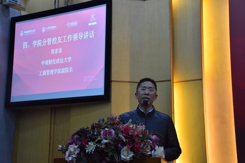 工商管理学院负责校友工作的郑家喜副院长在发言中首先感谢校友们长期对学校工作的支持,高度认可校友们的社会责任感。他指出,一个学校的学科建设水平代表着学校的高度,而校友工作则代表着一个学校的厚度。在未来的工作中,工商管理学院将继续保持高度重视校友工作并始终做到“共谋、共创、共荣”的宗旨。