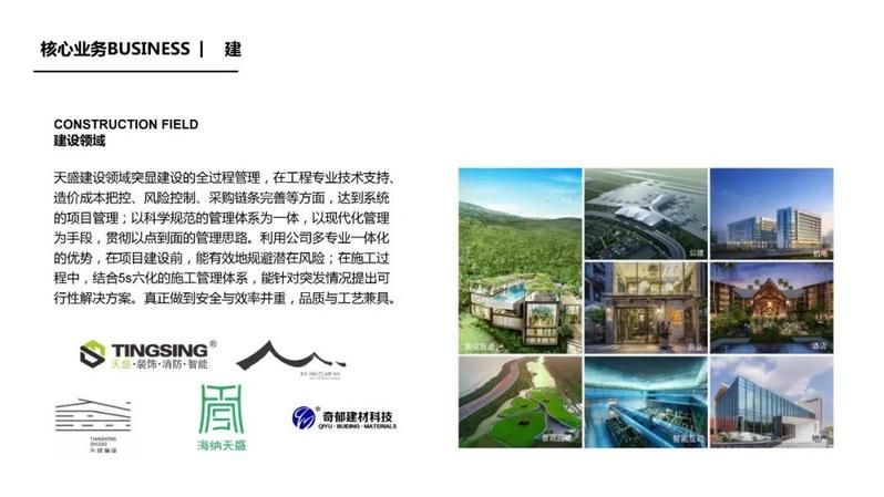 天盛文旅建设集团成立于2009年,2019年划分“文、商、旅、建”四大板块,在众多合作伙伴支持认可和全体员工努力下,天盛文旅建设逐渐成为一家在建设、文旅领域的规划、设计、施工、投资于一体的综合运营公司,集团的核心业务: