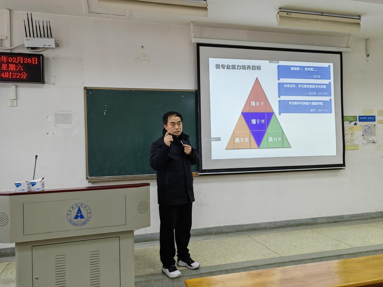 (通讯员 穆文)2022年2月26日下午2:00,数智化创新管理微专业开班仪式在文泰楼207举行。参加本次开班仪式的有工商管理系系主任石军伟教授、毛江华副教授、穆文博士,以及入选首批数智化创新管理微专业培养项目的二十多名来自全校各学院的本科生。因疫情防控原因,部分学生通过腾讯会议线上参加了本次开班仪式。