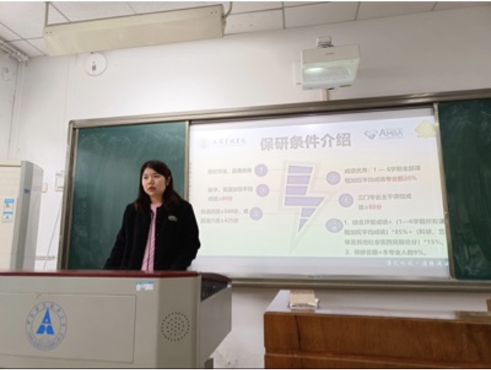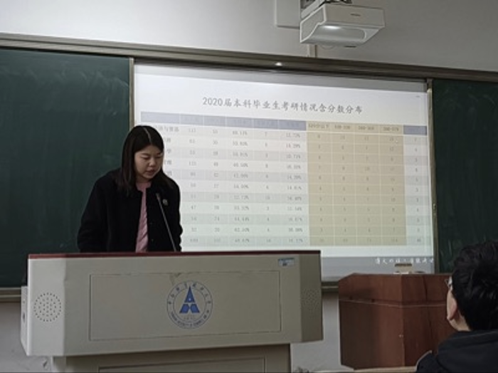 随后,刘老师为同学们介绍了辅修双学位、保研、考研的条件,针对2020-2021屆本科生毕业的考研总体情况整理了学情分析数据,带领同学们详细总结和分析,从而寻找动力,不断提高。并提醒同学们严格遵守学校和学院的各项规章制度,做好大一下学期的规划。