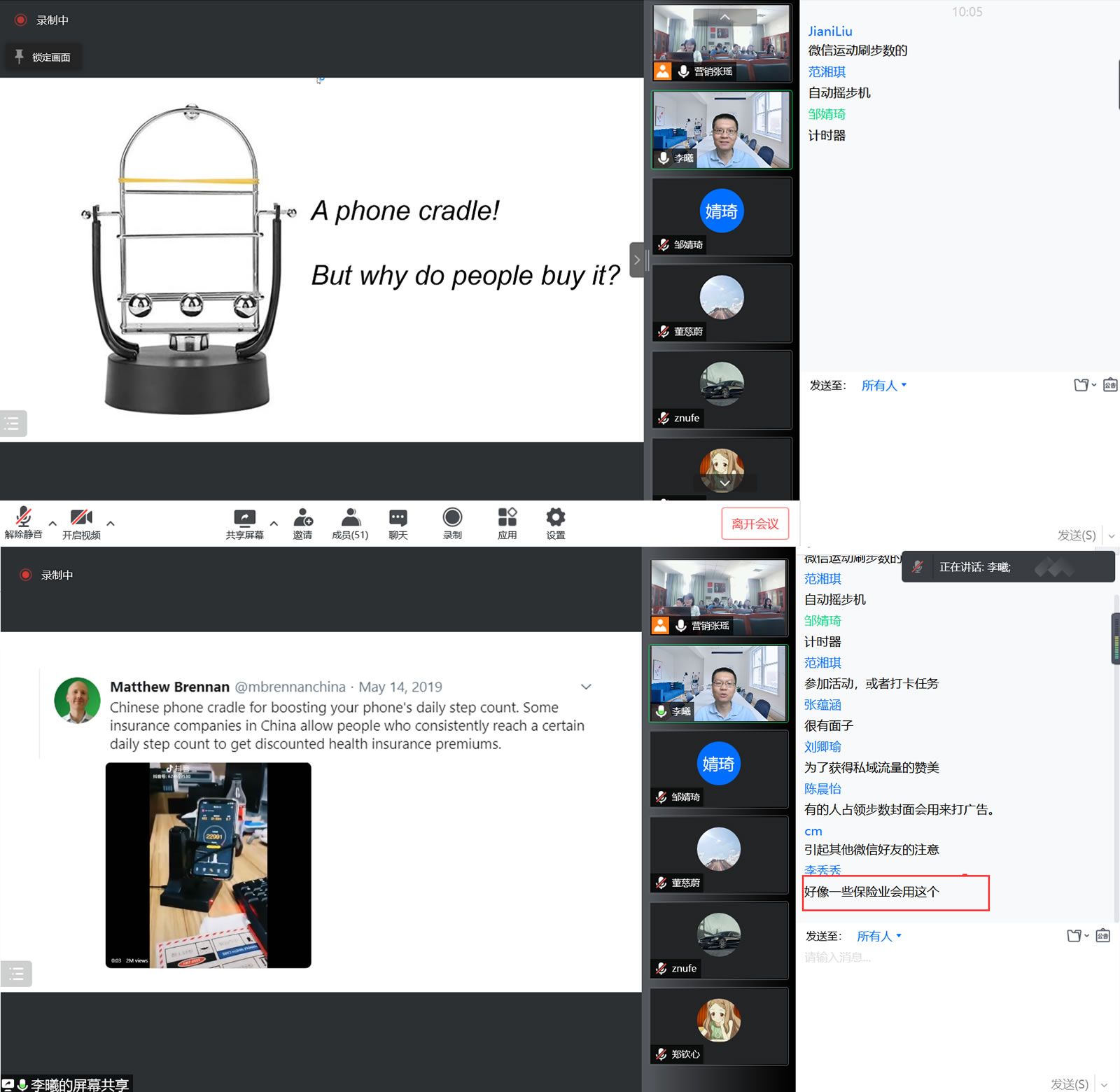 在正式介绍研究内容之前,李老师向我们展示了一款新奇的产品,邀请大家猜测这是一款用做何用的产品。线上和线下的同学纷纷猜测:“计时器、沥水器、手机微信刷步数的....”。之后李老师为大家揭晓答案。这是一款自动摇步机,用来刷每日步数的。