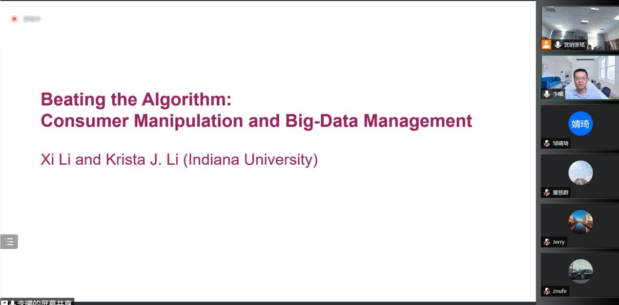 (通讯员:邹婧琦)2022年4月8日上午10点,工商管理学院营销管理系学术系列讲座第96期在线上线下同步开展,我们邀请到香港大学经管学院市场营销系教授李曦老师与我们分享与大数据算法紧密相关的营销前沿研究。本校工商管理学院的各院系老师和学生积极参与了本次学术讲座,