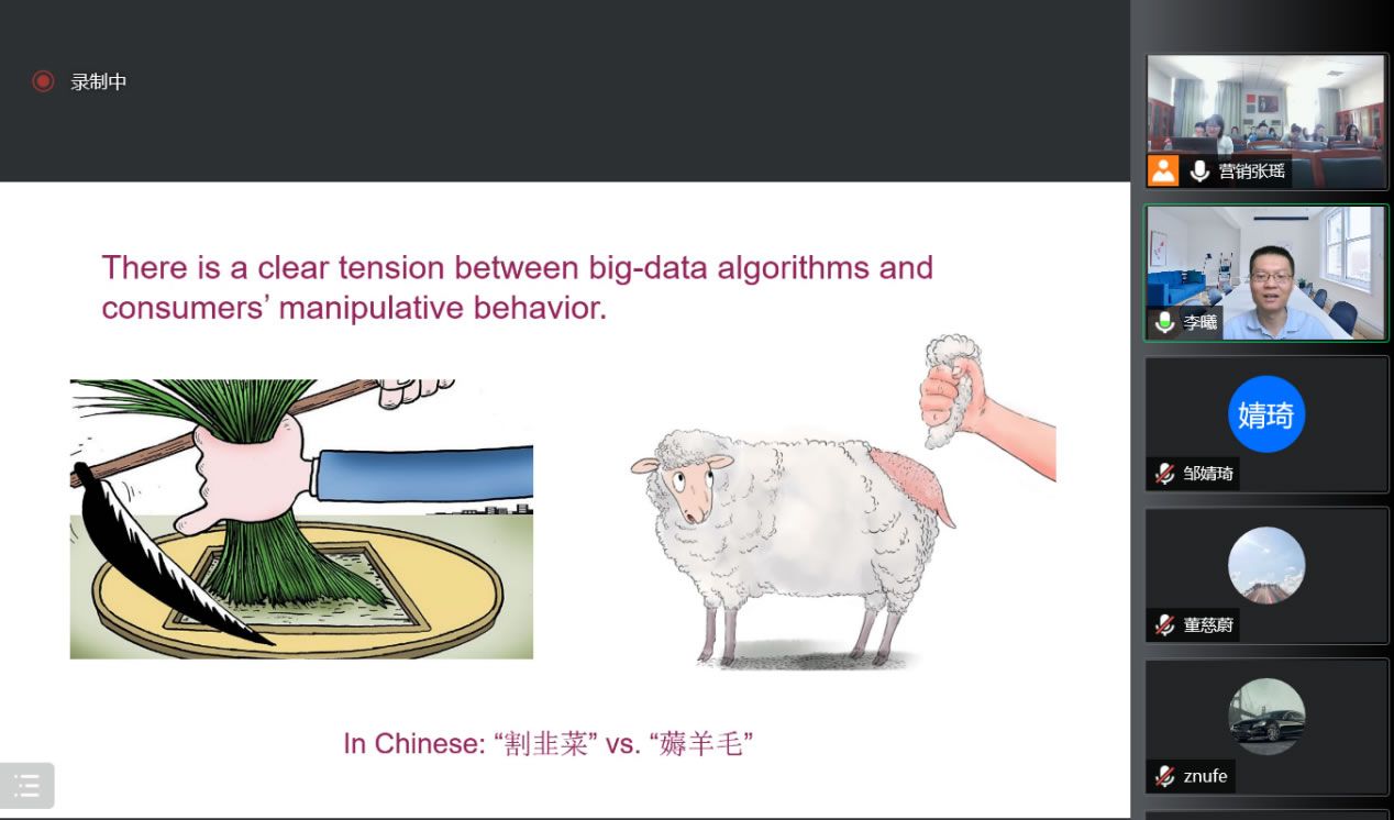 营销管理系冉雅璇老师主持了本次活动,费显政老师、董慈蔚老师、刘晓峰老师、张婷老师等参与了此次讲座,大家针对生活中的大数据杀熟、薅羊毛、个性化定价、企业收集数据的利弊、消费者篡改数据等话题展开了热烈且互动极强的探讨。