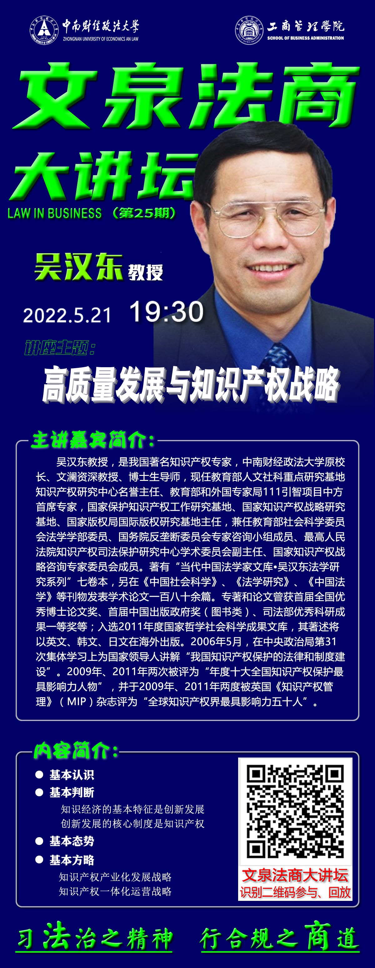 | 第25期 | 5.21(周六) 19:30 | 吴汉东教授 | 米兰电竞·(中国区) | 高质量发展与知识产权战略 |