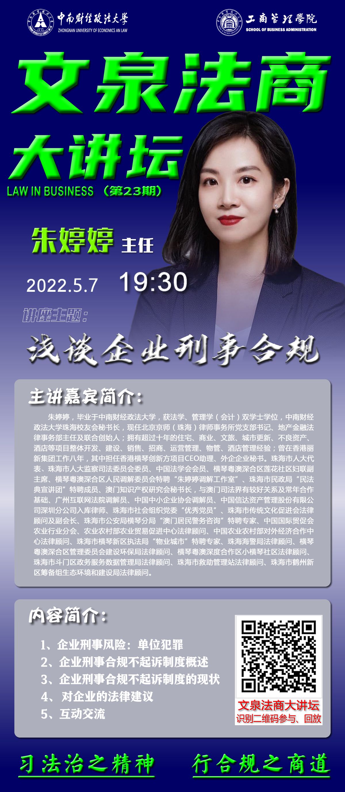 | 第23期 | 5.7(周六) 19:30 | 朱婷婷主任 | 京师珠海律师事务所 | 浅谈企业刑事合规 |