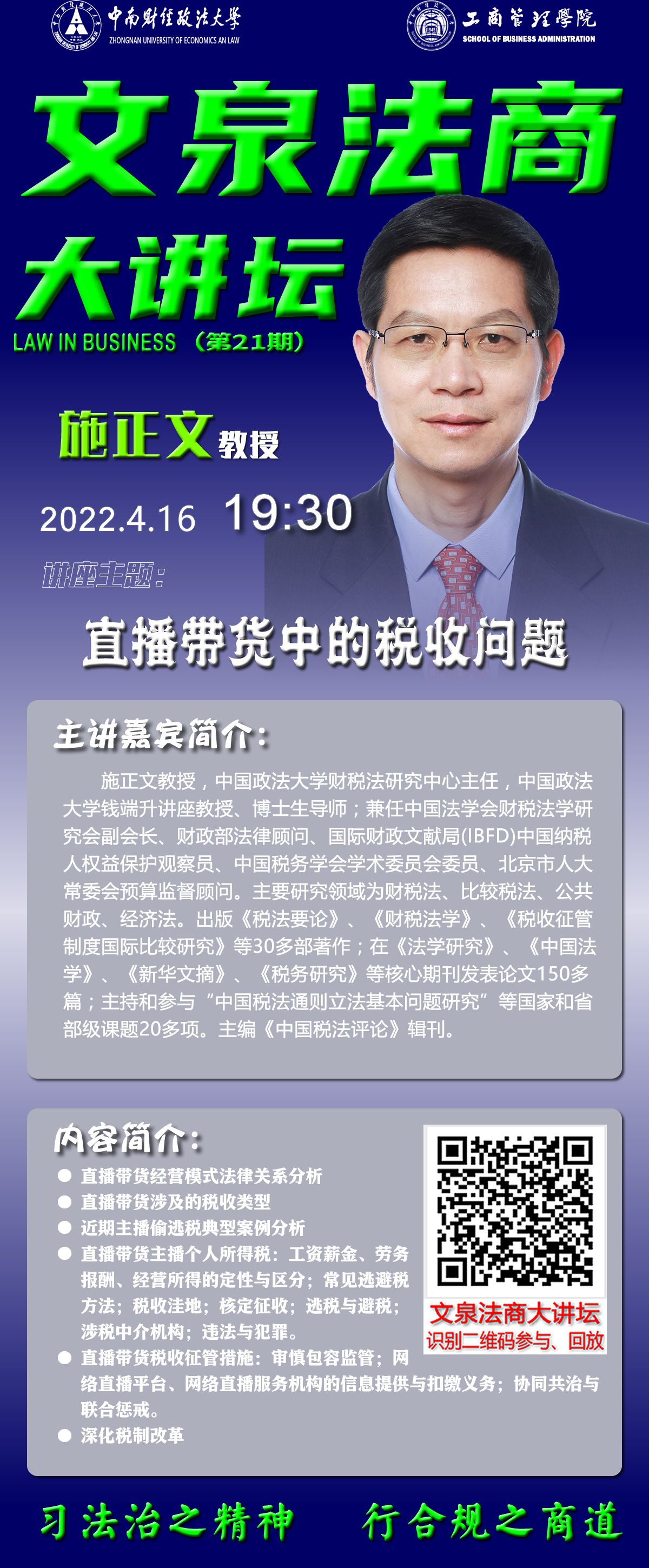 | 第21期 | 4.16(周六) 19:30 | 施正文教授 | 中国政法大学民商经济法学院 | 直播带货中的税收问题 |