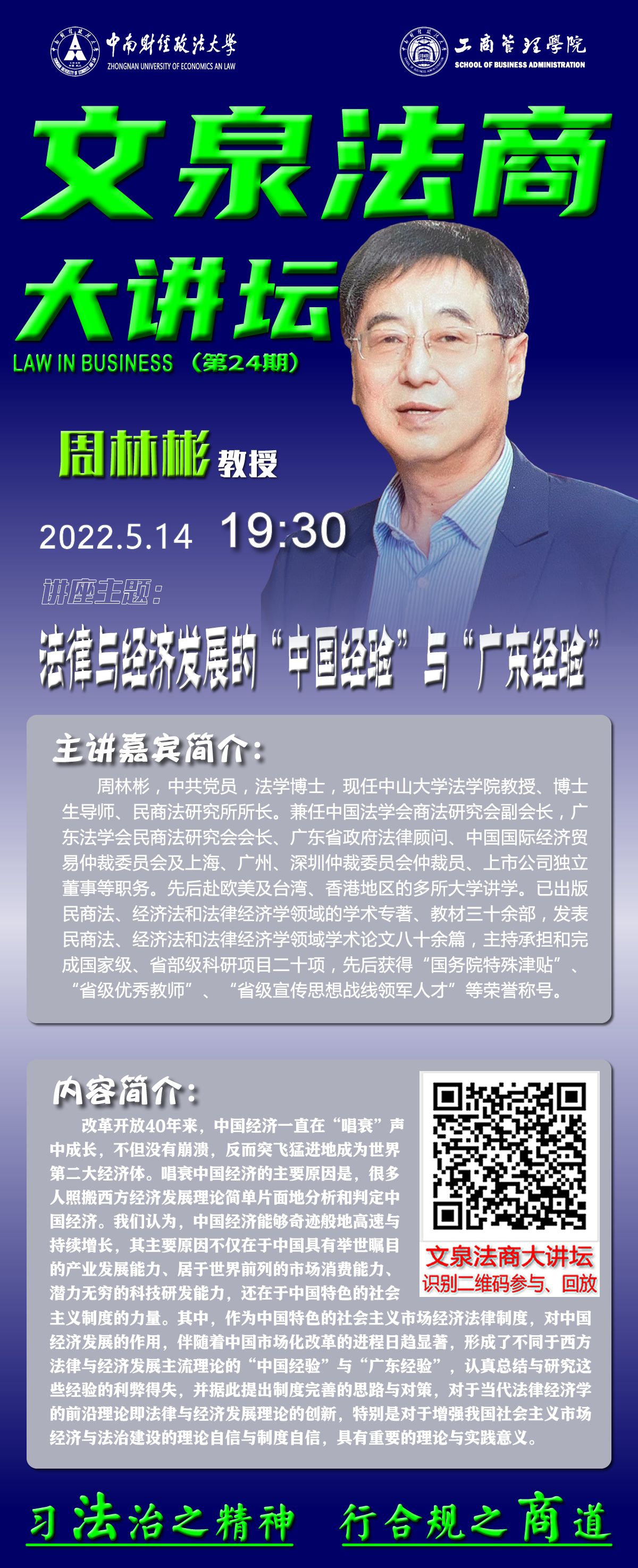 | 第24期 | 5.14(周六) 19:30 | 周林彬教授 | 中山大学法学院 | 法律与经济发展的“中国经验”与“广东经验” |