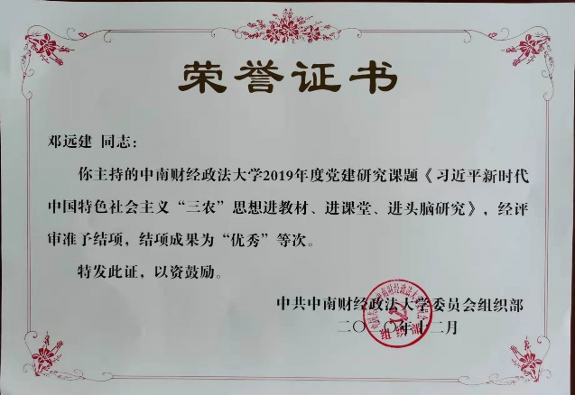 党建研究与教学科研深度融合。支部书记邓远建同志主持完成了学校下达的《习近平新时代中国特色社会主义“三农”思想进教材、进课堂、进头脑研究》党建研究课题,结项成果获评“优秀”。该支部完成的“‘三先一协同’——党建引领决战决胜脱贫攻坚”案例,获学校第二届“支部好案例、书记好党课、党员好故事”展评活动——“支部好案例”一等奖。党建研究取得一定成绩,并与教学科研深度融合,效果不断显现。农林经济管理专业于2019年入选第一批国家级一流本科专业建设点;2021年农林经济管理入选“十四五”湖北省高等学校优势特色学科(群)建设名单;“乡村振兴湖北省农科院农业技术经济研究所研究生工作站”获批湖北省研究生工作站,“百校联百县-高校服务乡村振兴科技支撑行动计划(2021-2025)”项目获得湖北省教育厅立项;《农业政策学》被认定为湖北省一流本科课程。吴海涛同志于2019年申请获得了国家社会科学基金重大项目《中国相对贫困的多维识别与协同治理研究》立项。