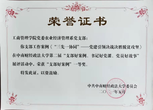 通过不断探索和实践,该支部党建与业务工作融合度稳步提升,并形成良好的经验:一是深化理论学习,不断提高支部成员的理论水平与政治素养;二是突出学科特色,不断夯实党建工作的主体地位和引领作用;三是加强实践实训,不断提升农经师生的专业技能与综合素质;四是服务时代需求,不断释放基层组织的堡垒作用与示范效应。在学校党委开展的“七一”表彰中,该支部分别于2019年和2021年获“脱贫攻坚先进集体”“先进基层党组织”荣誉称号。
