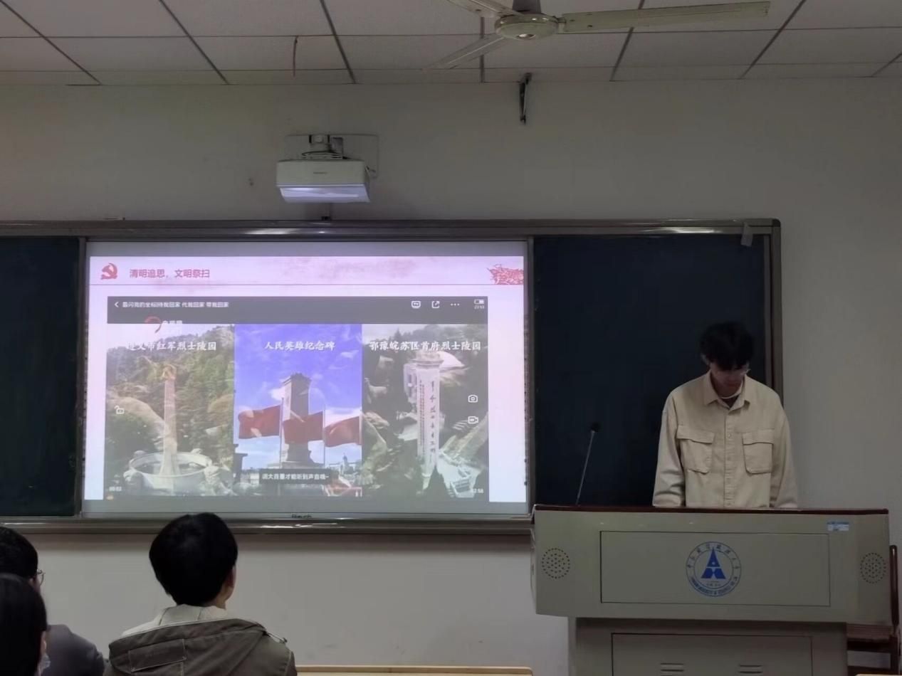 随后,在“清明追思,文明祭扫”这一环节中,钱蔚播放了一则烈士回家的视频。“待我回家,带我回家,代我回家”,短短十二个字道尽了烈士的一生同学们深受触动而后同学们纷纷分享自己家乡清明习俗习俗不同,方式不同,但相同的是我们对逝者、对英雄同样的缅怀与崇敬。同时,由于疫情形势依旧严峻,钱蔚同学向同学们发出网上祭扫的倡议。其实,祭扫活动重于行而不拘于形,只要有真心真情,无论在何时何地、以何种方式,都可以遥寄先人,表达对先人的缅怀和思念。