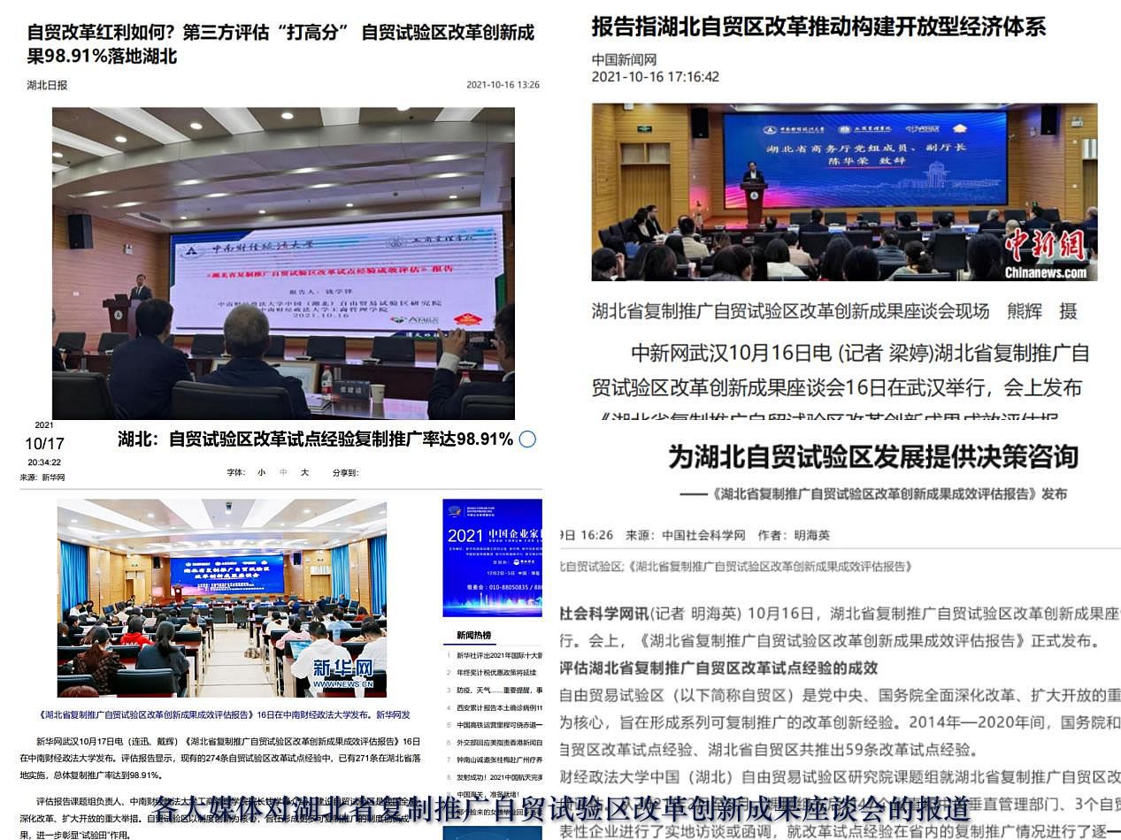 研究院成功举办“湖北省复制推广自贸试验区改革创新成果座谈会”,并于会上发布《湖北省复制推广自贸试验区改革试点经验成效评估报告》。这是全国首次开展的对省级层面复制推广自贸区改革创新成果的成效评估。众多国内知名专家学者,如南开大学原副校长佟家栋教授、山东财经大学校长赵忠秀教授、广东外语外贸大学副校长何传添教授等参会并围绕自贸试验区改革创新发展发表主题评论。本次会议也进行了线上同步直播,全国近百位师生以及业内人士通过网络方式观会学习。新华网、人民网、湖北省人民政府门户网站、湖北日报、湖北卫视等省内外10余家知名媒体进行了报道宣传,扩大了湖北自贸试验区在全国的影响。