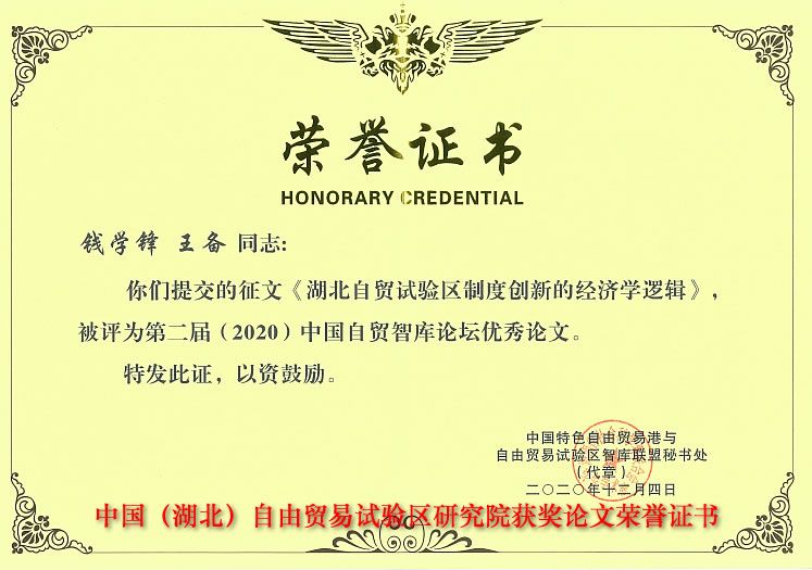 与此同时,研究院也积极走出去,广泛参与各地自贸试验区举办的学术交流活动,相关研究成果获得多项奖励。例如,在第二届(2020)中国自贸智库论坛中,研究院钱学锋院长论文《湖北自贸试验区制度创新的经济学逻辑》被评为优秀论文;在第三届(2021)中国自贸智库论坛中,研究院科研人员投稿的《湖北省复制推广自贸试验区改革试点经验成效评估研究》、《建设国际物流中心 助力内陆自贸区发展——以湖北自由贸易试验区为例》、《内陆自贸区的区域辐射带动效应:机制、评估及优化对策》等3篇论文入选此次活动论文集,预计2022年出版发行。