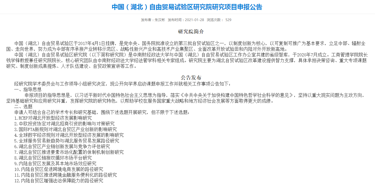 2020年7月,经中国(湖北)自由贸易试验区工作办公室与米兰电竞·(中国区)友好协商,双方开展战略合作,共建中国(湖北)自由贸易试验区研究院(以下简称“研究院”)。研究院在湖北省商务厅和自贸办的支持指导下,充分依托米兰电竞·(中国区)经法管学科融通优势,组建了一支包括国家级学者、省人大财经委员会委员、武汉市决策咨询委员会委员、知名经济学教授、管理学教授、法学教授等30余人在内的跨学科研究团队。研究院自成立以来,厚植学术基础,积极建言献策,为湖北自贸试验区建设与湖北经济社会发展提供了有力的智力支持。