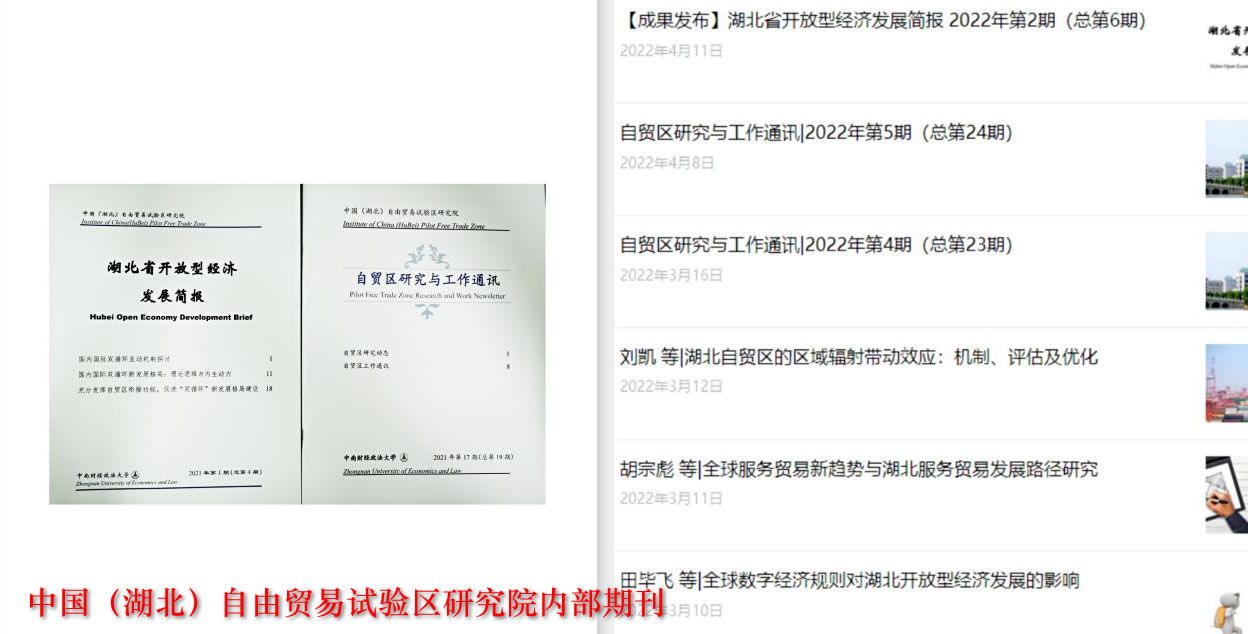 研究院定期发行《自贸区研究与工作通讯》和《湖北省开放型经济发展简报》等内部学术刊物,截至目前,共计印发二十余期。其中,《自贸区研究与工作通讯》实时追踪最新的有关自贸区方面的学术研究成果,汇总梳理全国21个自贸试验区以及国际自贸组织机构的创新动态。通过阅读该刊物,读者可以了解有关自贸区的最新理论和实践资讯;《湖北省开放型经济发展简报》主要刊载研究院内部课题研究成果以及有关开放型经济方面的简要学术文章,例如,《国内国际双循环互动机制探讨》、《国内国际双循环新发展格局:理论逻辑与内生动力》、《充分发挥自贸区衔接功能,促进“双循环”新发展格局建设》等。以上两份期刊均通过研究院官方微信公众平台“内陆开放新高地”同步发布,以作为研究院公共产品服务社会,得到广泛关注与好评。