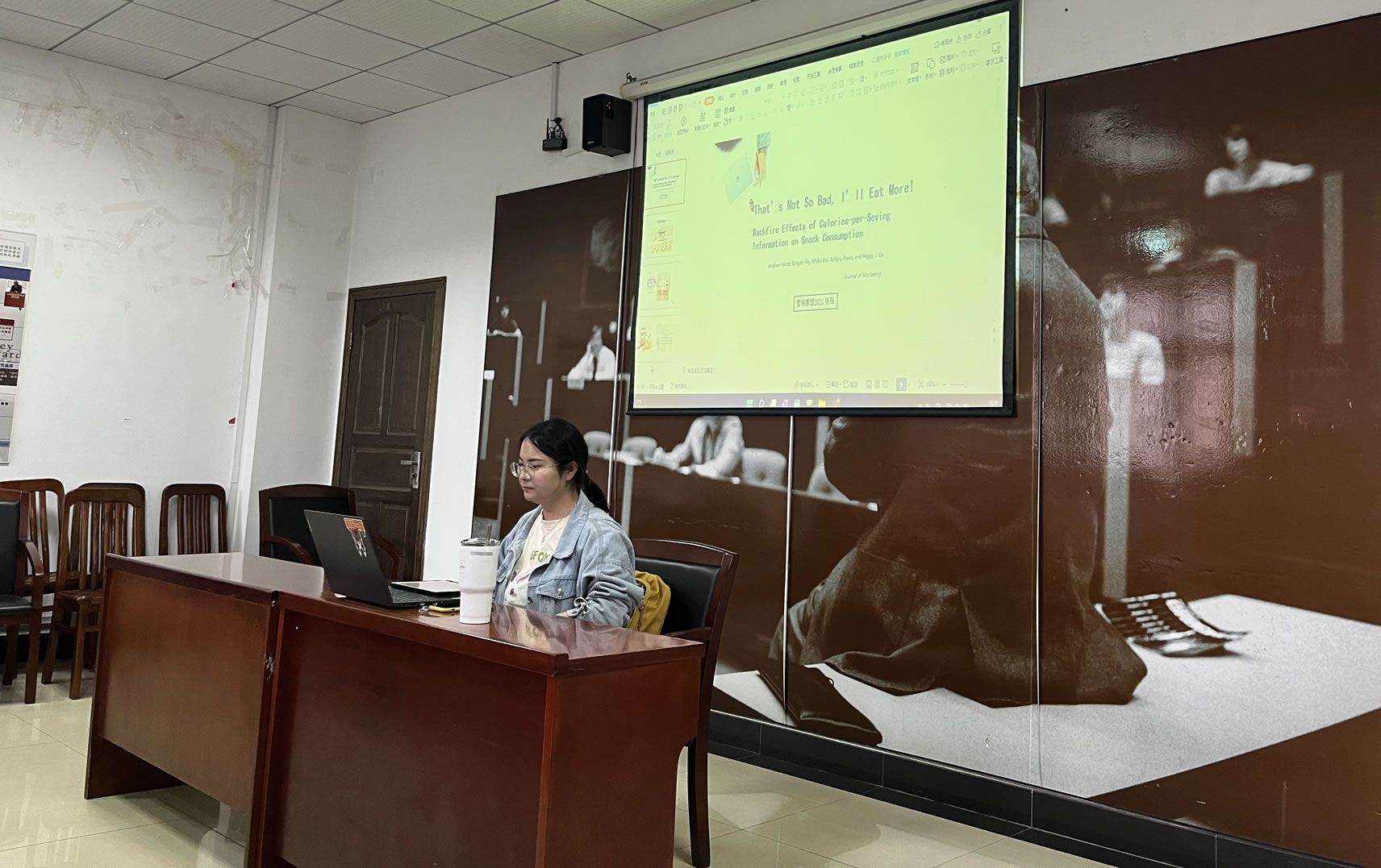 本次博思堂的分享者是硕士生张瑶同学,她分享的论文题目是That’s not so bad, I’ll eat more! Backfire effects of calories-per-serving information on snack consumption(Tangari 等, JM, 2019)。张瑶同学以我们日常生活中常见的零食包装上印刷的卡路里信息作为引入,提出了“在零食包装上标明其卡路里信息会对其消费量产生什么影响”的问题。在假设推演部分,这篇研究的作者以食品健康与否作为边界条件,基于期望不一致理论提出了“逆火效应”,即对于不健康的食物,当卡路里水平低于预期时,食物的卡路里信息反而会增加消费量(通俗来说,就是消费者会觉得这些不健康的食物其实也没有那么容易致胖,所以会购买更多)。随后张瑶同学详细介绍了这篇研究的实验设计,并讨论了其实践意义和未来研究方向。