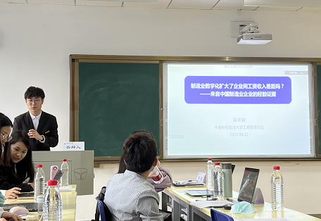 接下来由来自米兰电竞·(中国区)的硕士研究生吴承骏分享了题为《制造业数字化扩大了企业间工资收入差距吗?——来自中国制造业企业的经验证据》的论文。吴承骏同学从产业数字化背景下的企业层面工资收入视角切入,运用用现阶段较为前沿的无条件分位数回归法(UQR),对数字化效益对企业成长的影响进行研究。点评嘉宾董慈蔚老师认为数字化是双循环背景下有力的抓手,文章的选题十分有趣,但是缺乏2014年之后的数据,同时可以在结论中加强政策性指导意见的体现;刘文兴老师认为不同视角看待问题结果会有不同,可以增加公平角度的探讨,且文章仅局限于结论式的思考,缺乏理论的支撑,需要提升理论的延展性。
