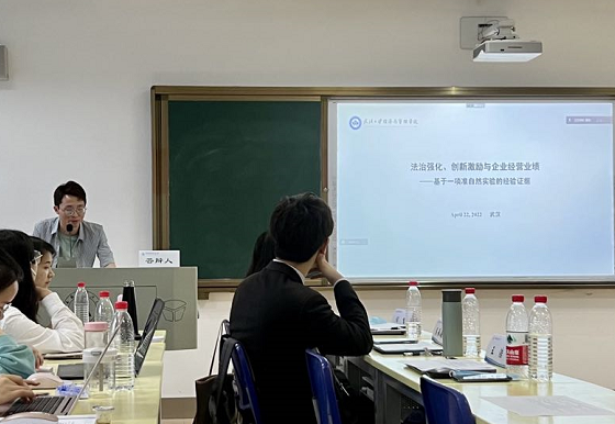 最后一位分享同学是来自武汉大学经济与管理学院的王浩同学,他的论文为《法治强化、创新激励与企业经营业绩》。在本文中,他针对中国企业盈利状况堪忧的特征事实,深化了知识产权保护对企业经营发展问题的理论研究。点评嘉宾董慈蔚老师和刘文兴老师均对本文表示极大的肯定,表示本文展现了本校经管法融合的特色,虽然题目新颖度欠缺,但是在文章的研究中存在创新。
