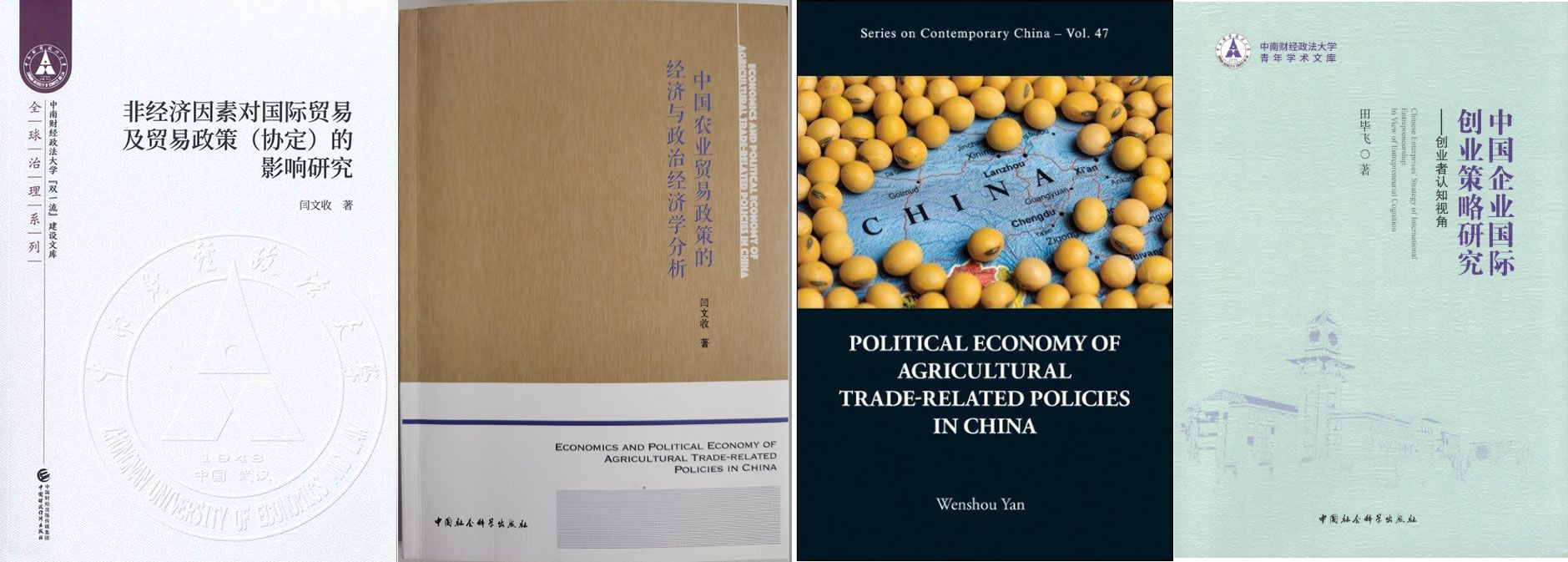 《中国企业国际创业策略研究——创业者认知视角》;闫文收副教授于2019年出版了学术专著《中国农业贸易政策的经济与政治经济学分析》、2019年出版了学术专著《非经济因素对国际贸易及贸易政策(协定)的影响研究》、2021年出版了专著《Political economy of agricultural trade policy in China》。