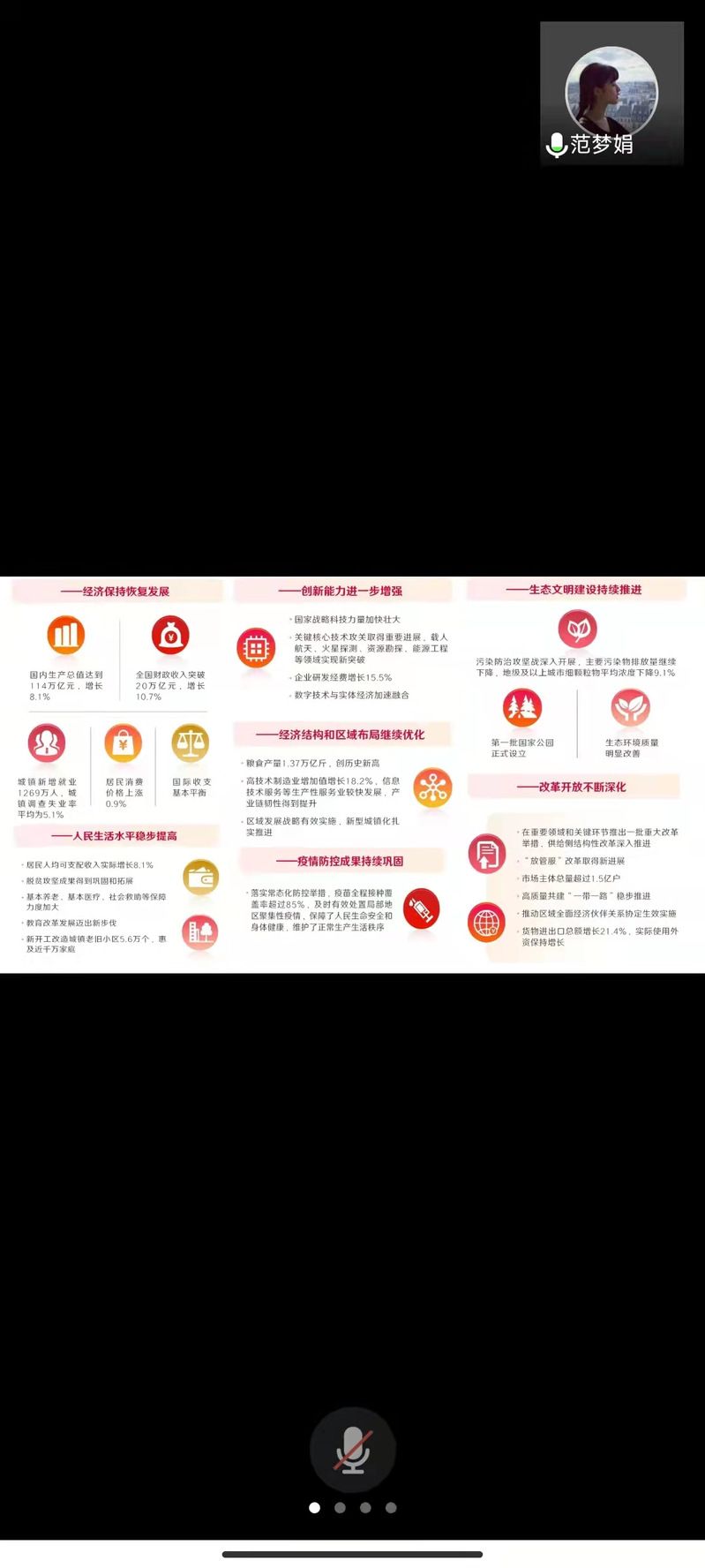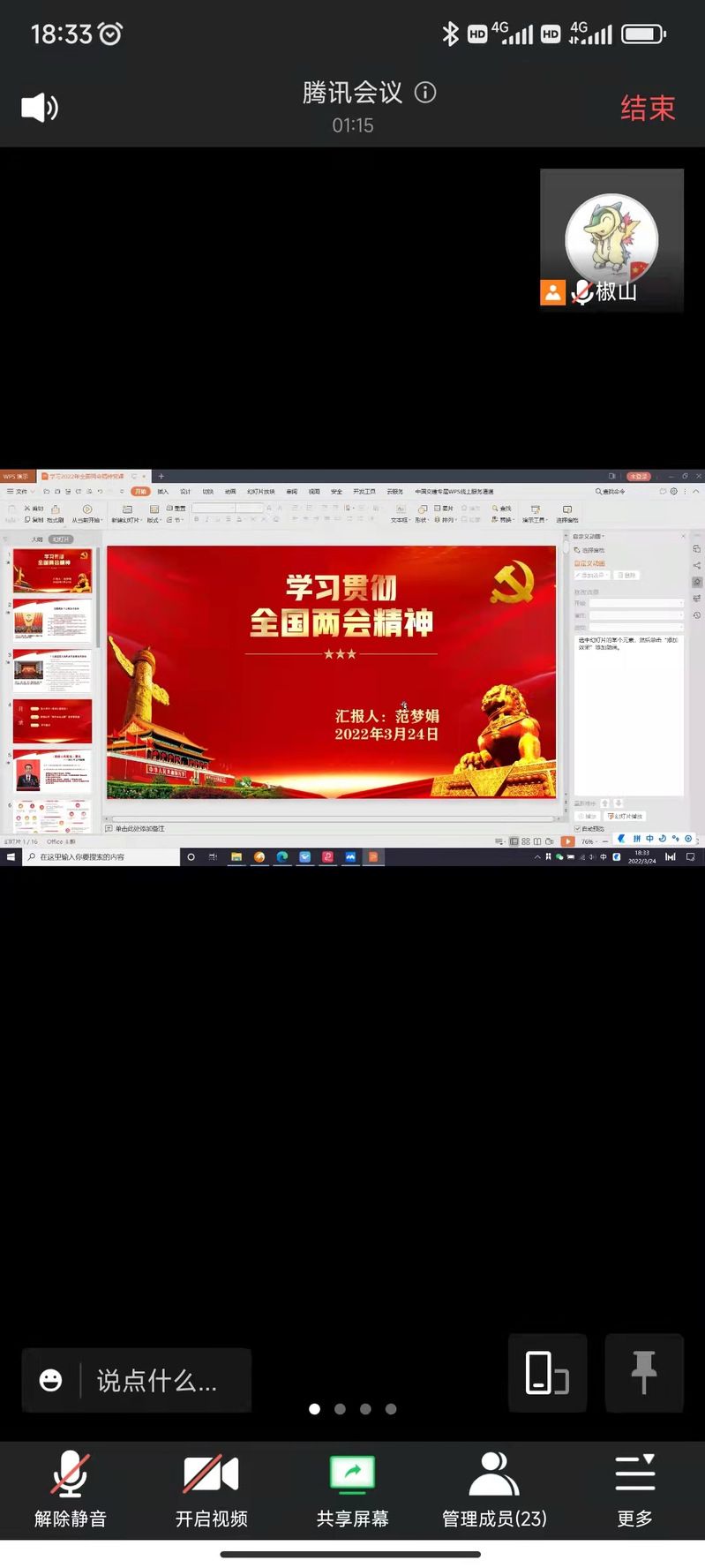 本次活动采用线上学习的方式,由党支部书记卢泓钢同志主持、范梦娟同志带领大家学习贯彻全国两会精神。首先,范梦娟同志向各位党员同志介绍了3月4日-3月10日在北京人民大会堂召开的全国政协十三届五次会议主要内容,以及3月5日-3月11日在北京人民大会堂召开的第十三届全国人民代表大会第五次会议主要内容。