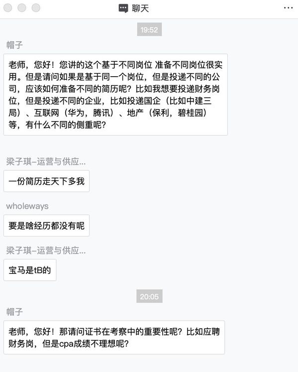 结束分享后,谢莹老师与同学们进行了互动交流,同学们就如何针对不同公司准备简历以及证书在考察过程中的重要性进行请教。谢莹老师认为,有针对性的简历准备更能够凸显求职者对企业的重视,建议同学可以先深度了解企业岗位的相关招聘需求以及未来培养规划,然后再有针对性地准备个人简历,同时求职前期对个人经历的丰富十分必要,具有含金量的证书是加分亮点,简历内容需要突出优势。