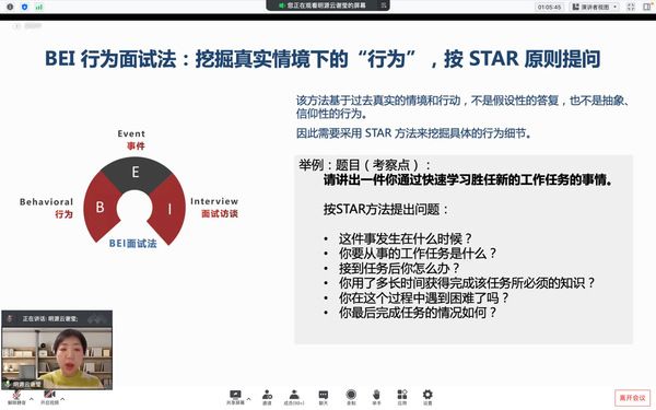 在应届生常见面试工具及应对要点部分,谢莹老师从BEI面试方法引入,介绍了企业运用的普遍面试工具,丰富了同学们对企业考察过程的认知,并分结构探讨了面试过程中的常见问题,逐一进行深入剖析,并提供应对建议。同时针对面试环节进行要点提炼,谢老师深度介绍了面试前的必要准备与面试过程中的贴切表达,为同学们未来的面试表现打下了牢固的基础。