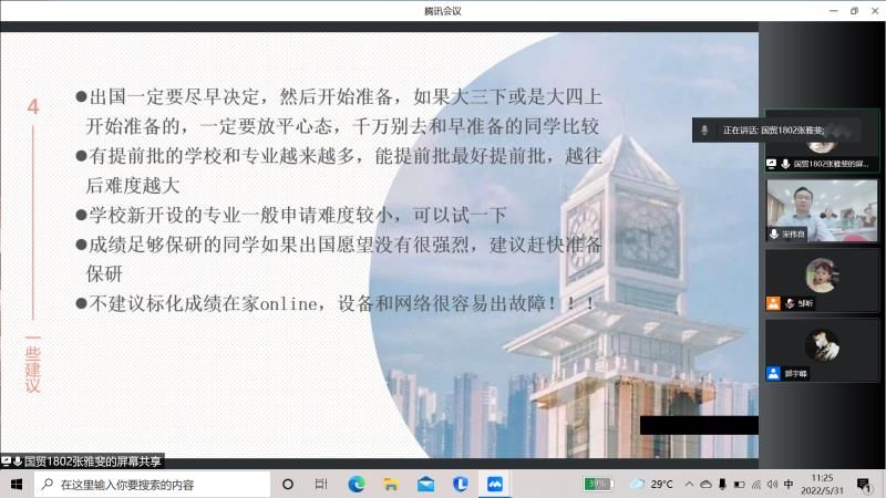 姜师姐本科在我校毕业后,顺利申请新加坡国立大学的Business Management专业攻读硕士学位。通过现场微信连线远在新加坡的姜师姐给同学们进行分享,她认为首先是同学们要明确留学目的,根据不同需求,正确选择适合自己学校、硕士类型和专业方向。然后在此基础上,做好学校申请需要的雅思、文书和本科GPA等必要的前期准备工作和面试时所具备的表达能力。最后,师姐分享了在新加坡国立大学的就读体验并解答了同学们的有关疑问。结束后,同学们通过掌声表达了对姜师姐的感激。