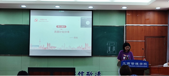 国际贸易专预备党员苏欣同学分享了自己报考“西部计划”的经历。苏欣同学讲到,在报考的过程中,她更深刻地了解了国家的政策,了解了当代大学生的追求和责任,她期待和优秀的青年毕业生一起,到国家需要的地方去。