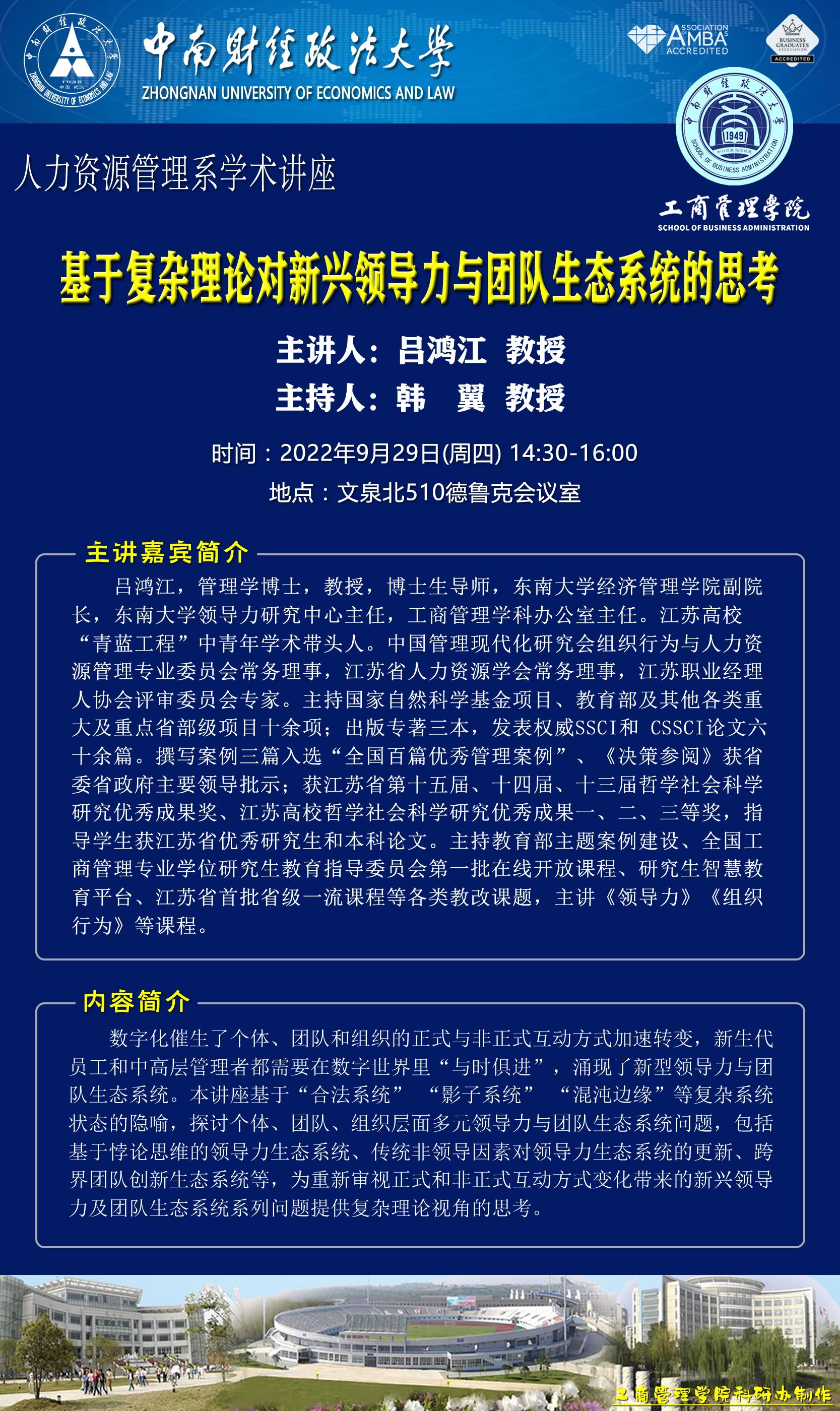 | 2022.09.29 14:30-16:00 | 文泉北510德鲁克会议室 | 人力资源管理系 | 韩翼 教授 | 吕鸿江 教授 | 基于复杂理论对新兴领导力与团队生态系统的思考 |