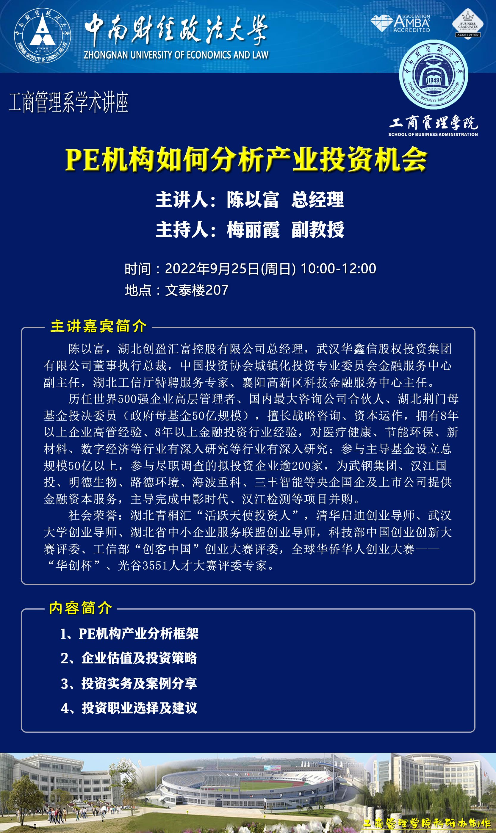 | 2022.09.25 10:00-12:00 | 文泰楼207 | 工商管理系 | 梅丽霞 副教授 | 陈以富 总经理 | PE机构如何分析产业投资机会 |