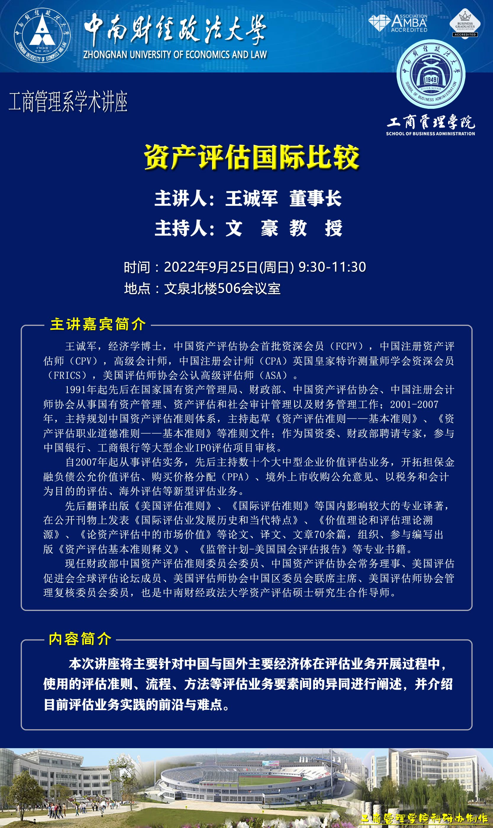 | 2022.09.25 9:30-11:30 | 文泉北楼506会议室 | 工商管理系 | 文豪 教授 | 王诚军 董事长 | 资产评估国际比较 |