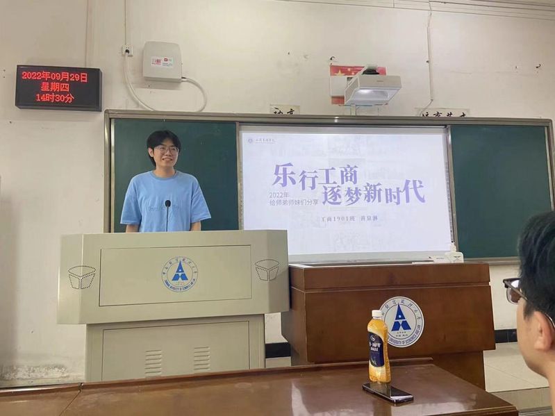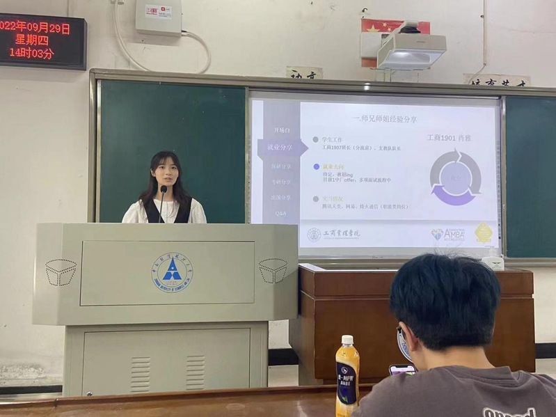 (通讯员:张乾毅、赵红红;摄影:陈棋欣、张乾毅)2022年9月29日星期四下午2:00,我院工商管理系在文澜楼104教室组织了一场工商管理专业本科生就业、保研、考研及出国经验分享会。本次分享会由工商2101班、2102班联合举办,工商管理系系主任石军伟教授、栗洋副教授、工商2101班班级导师刘文通老师和工商2102班班级导师穆文老师也来到了现场。本次经验分享会由工商2101班班长赵红红同学担任主持人,主讲嘉宾包括工商1901班肖雅同学、工商1901班张诗敏同学、工商1901班黄泉淋同学、工商国际1901班孙若蓓同学。工商管理学院工商2101班、2102班,以及2021级其他班的多位同学参加了本次活动。