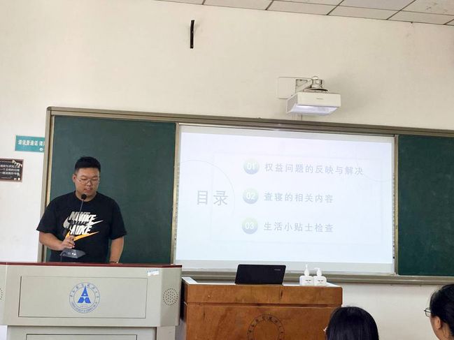 紧接着,生活权益部部门负责人余雷就寝室卫生检查做出了详细的解释与检查标准的说明,并结合实例向在场生活委员及班级代表讲述了可能遇到的问题以及解决方法。