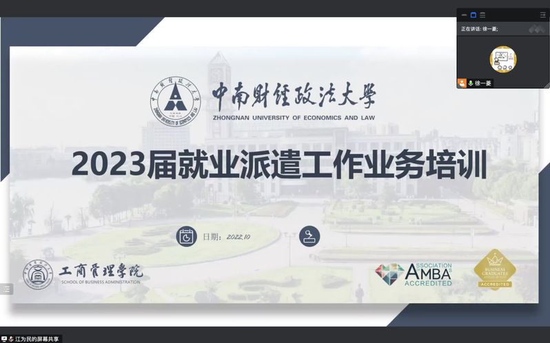 (通讯员:谢灵依)为了更好地帮助2023届毕业生了解就业协议签订规范,掌握毕业生档案派遣要求、户口迁移流程和相关就业政策,正确操作网签就业系统,工商管理学院于2022年10月6日在腾讯会议成功举办了2023届毕业生就业派遣暨网签培训会,此次培训由研究生辅导员江为民老师与徐一菱老师主讲,学院2023届全体毕业研究生参加。