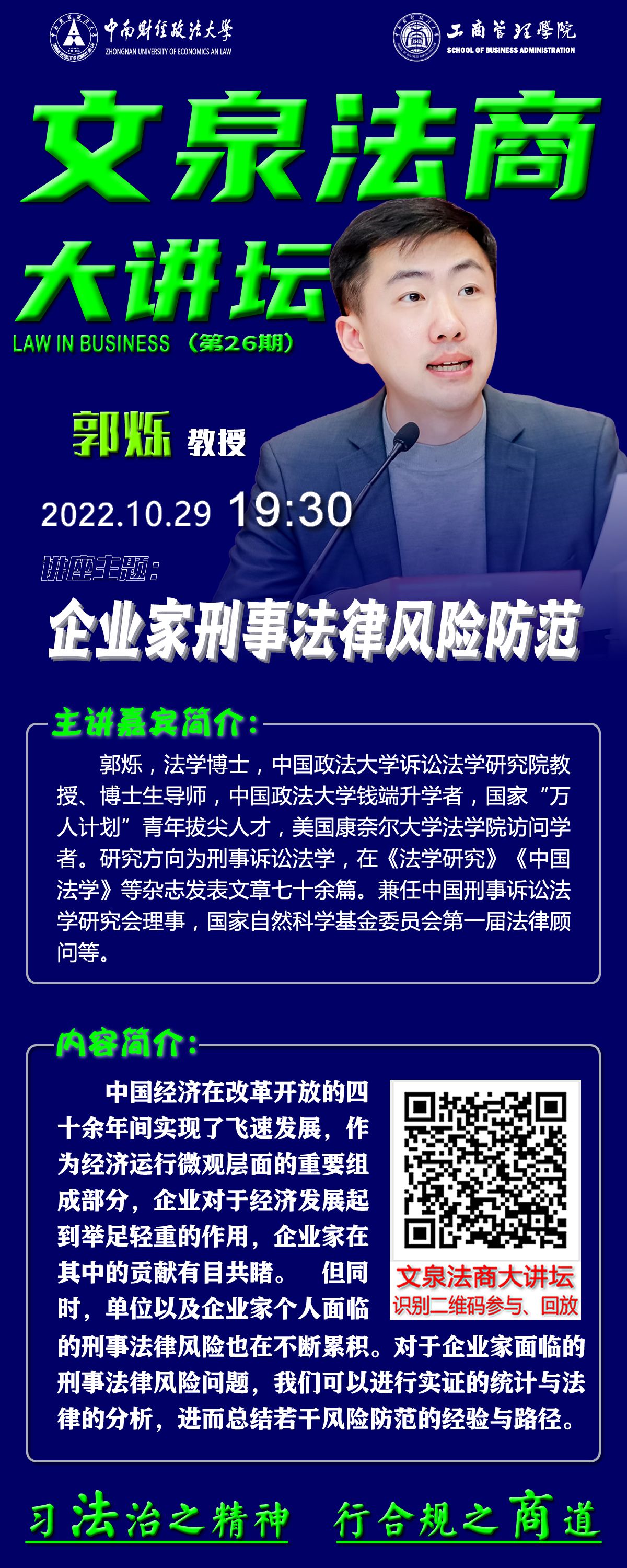 | 第26期 | 10.29(周六) 19:30 | 郭烁教授 | 中国政法大学 | 企业家刑事法律风险防范 |