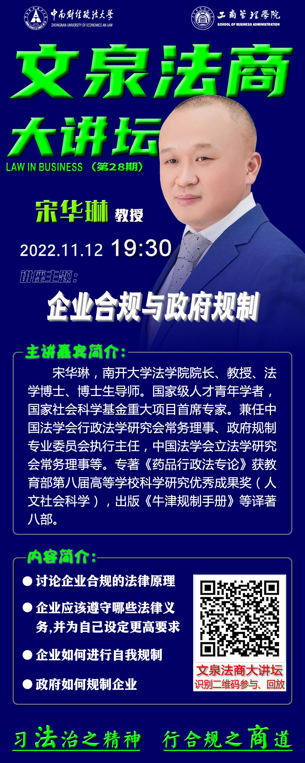 | 第28期 | 11.12(周六) 19:30 | 宋华琳教授 | 南开大学法学院 | 企业合规与政府规制 |