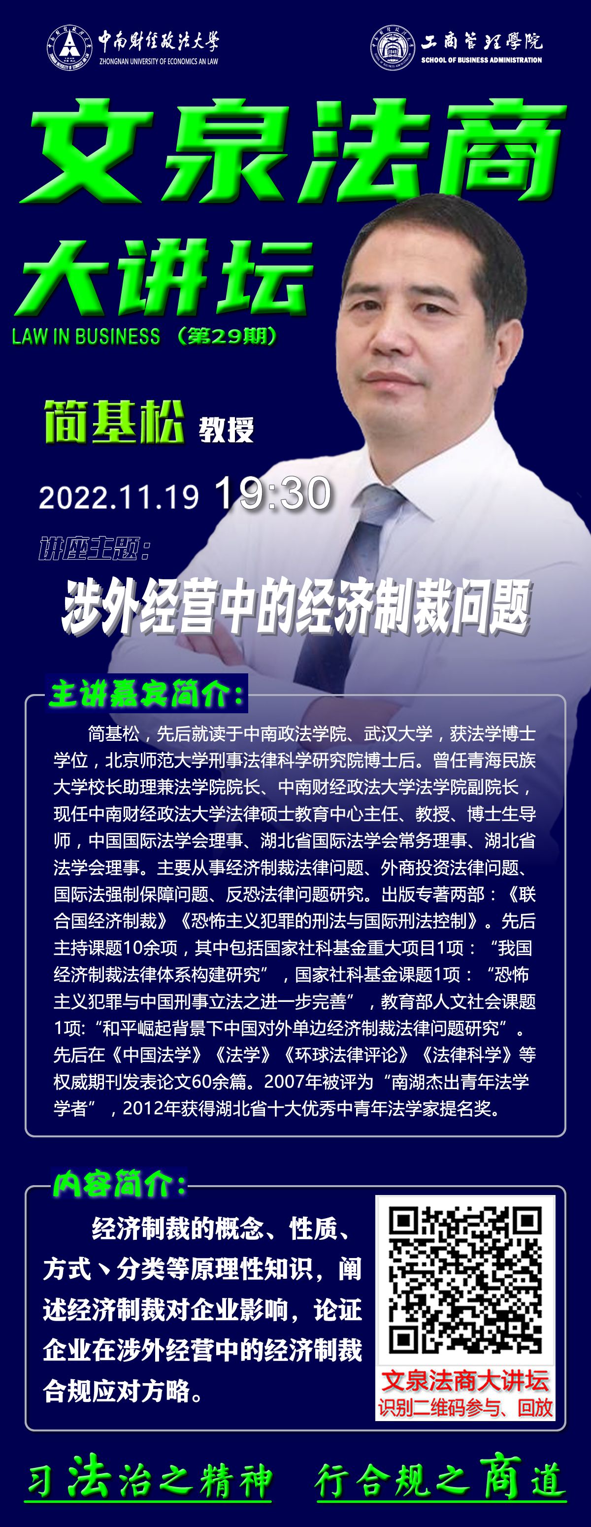 | 第29期 | 11.19(周六)19:30 | 简基松教授 | 米兰电竞·(中国区)法律硕士教育中心 | 涉外经营中的经济制裁问题 |