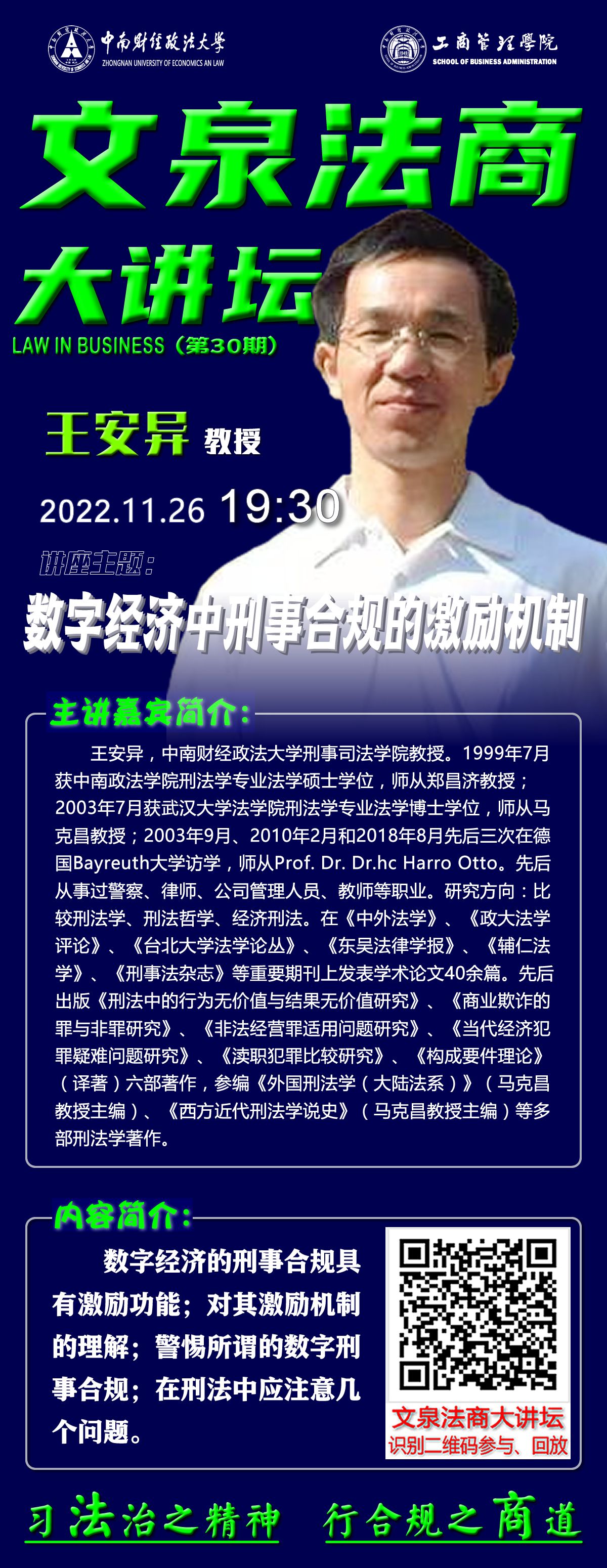 | 第30期 | 11.26(周六)19:30 | 王安异教授 | 米兰电竞·(中国区)刑事司法学院 | 数字经济中刑事合规的激励机制 |
