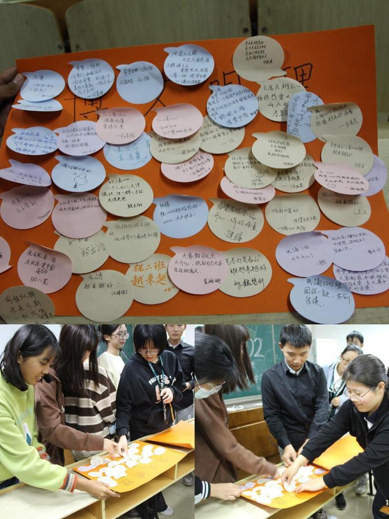 最后,“对于需要在一起生活四年的我们,班级是大家的归属和依靠,班级在我们大一开学的时候就已形成,希望大家今天能给咱们的班级过一个生日。”在心理委员贾震雷的真诚讲解下,每位同学用心写下自己对班级和同学们的真诚祝福,并亲手粘贴在展板上。“骄阳正好,风过林梢,此时我们正当年少;工商二班,筑梦青春,当下我们前途无量。”一字一句中充满了对班级未来的美好祝愿与殷切期望,工商2202班一定会在大家的祝福声中走向充满光明与希望的明天!