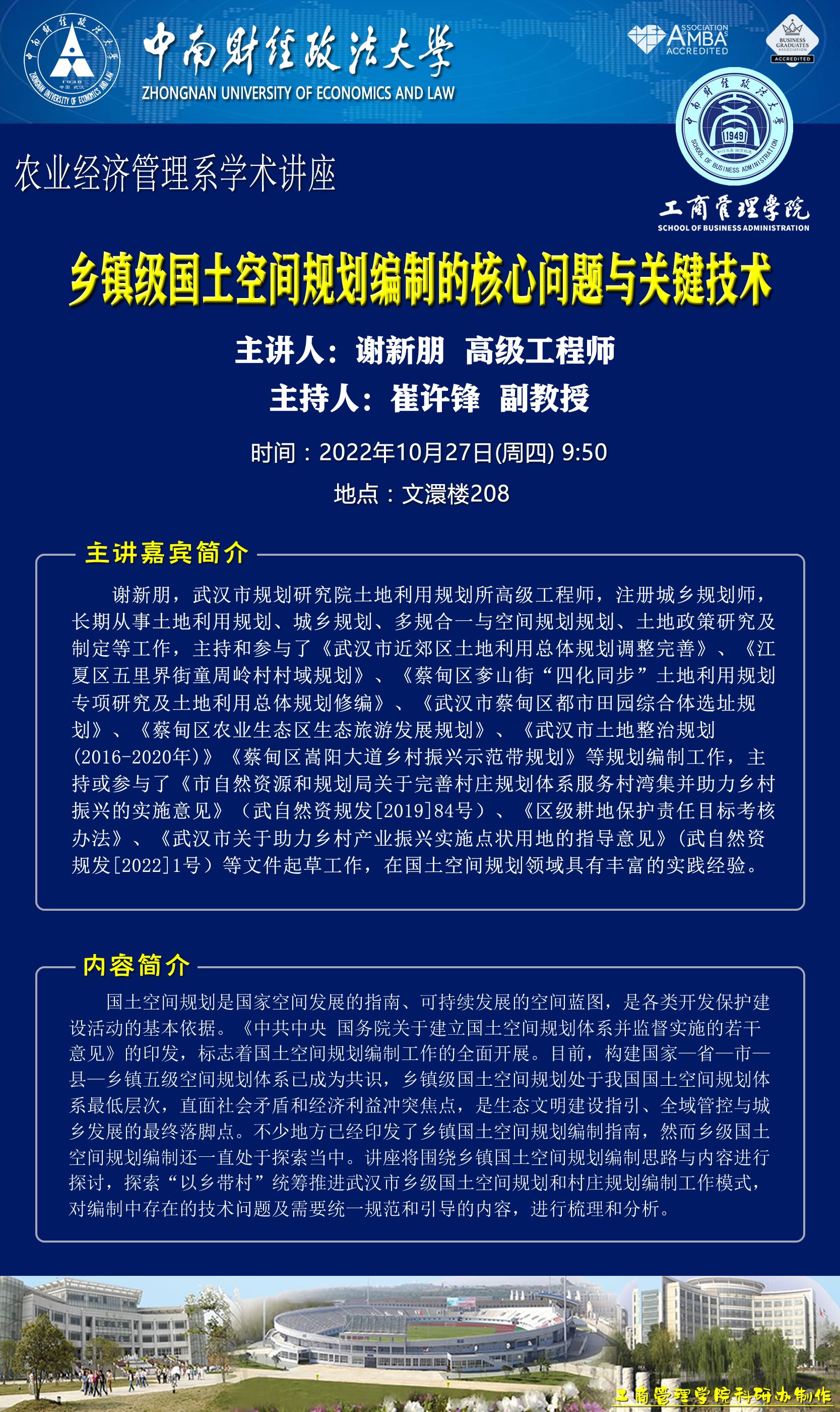 | 2022.10.27 9:50 | 文澴楼208 | 农业经济管理系 | 崔许锋 副教授 | 谢新朋 高级工程师 | 乡镇级国土空间规划编制的核心问题与关键技术 |