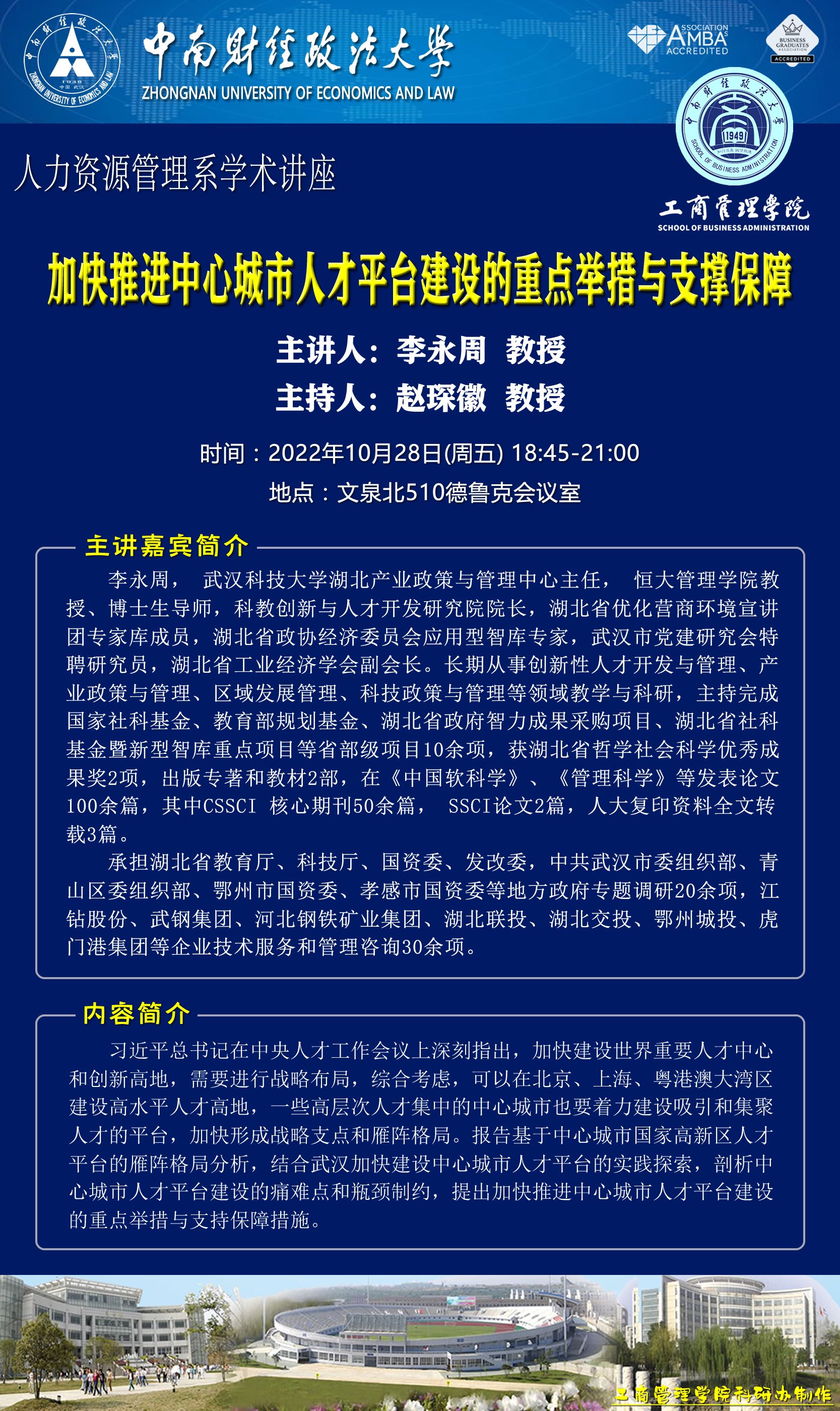 | 2022.10.28 18:45-21:00 | 文泉北楼510德鲁克会议室 | 人力资源管理系 | 赵琛徽 教授 | 李永周 教授 | 加快推进中心城市人才平台建设的重点举措与支撑保障 |