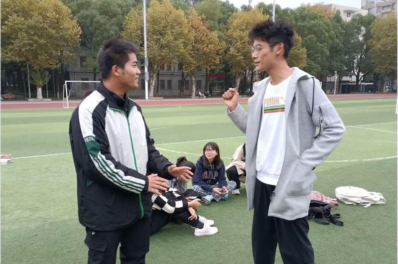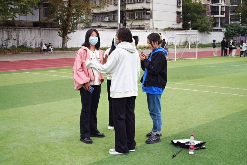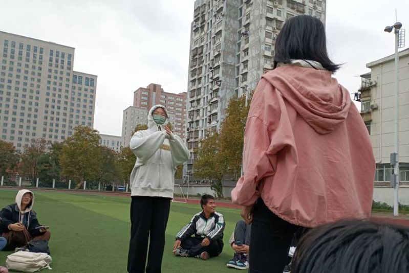 简单暖场过后,第二项互动小游戏——“传声筒”开始了!“传声筒”游戏既是记忆力的比拼,也是对团队默契的考验——一段文字在首位同学的传送中开始,经历三位同学的“加工改造”,由最后一位同学表述出来。游戏过程中,同学们被分成了三个小组。尽管每个小组的成员们都尽力传达自己听到的语段,但最终传达出的语段往往与题目大相径庭。周边观看的同学们都忍俊不禁,操场上洋溢着欢乐的笑声。