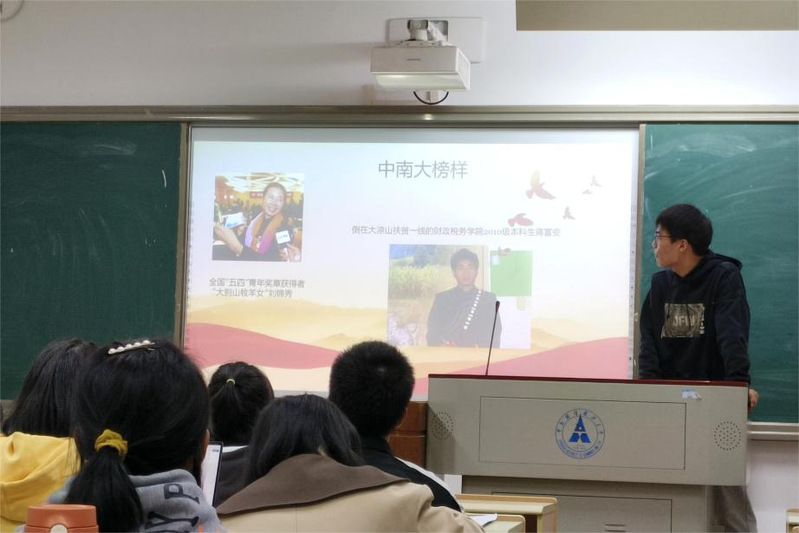 然后,尚稣平同学和曾健楠同学带来了一段以优秀青年榜样苏正民为原型的微情景剧。曾健楠同学扮演苏正民,尚稣平同学扮演其导师,两人在讲台上生动精彩的演绎既拉近了榜样与同学们之间的距离,也让同学们了解到了优秀青年榜样苏正民的光辉事迹。